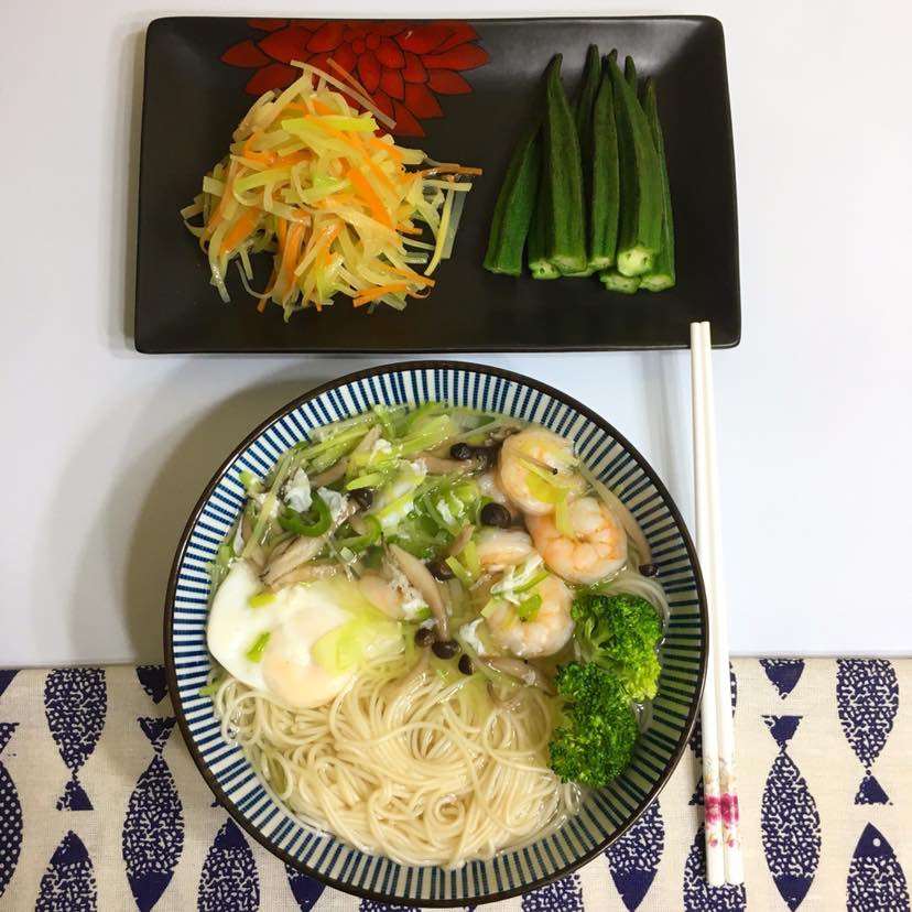 橄榄油青笋拌胡萝卜🥕白灼秋葵/西兰花🍤蟹味菇荷包蛋长寿面