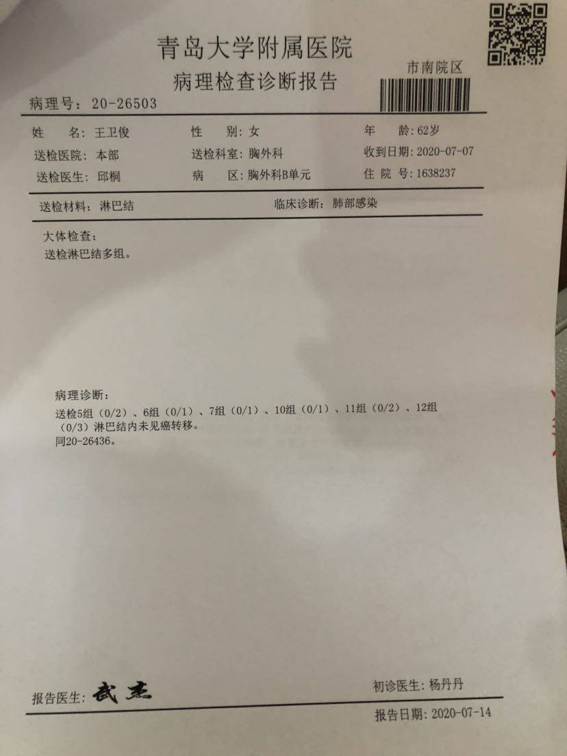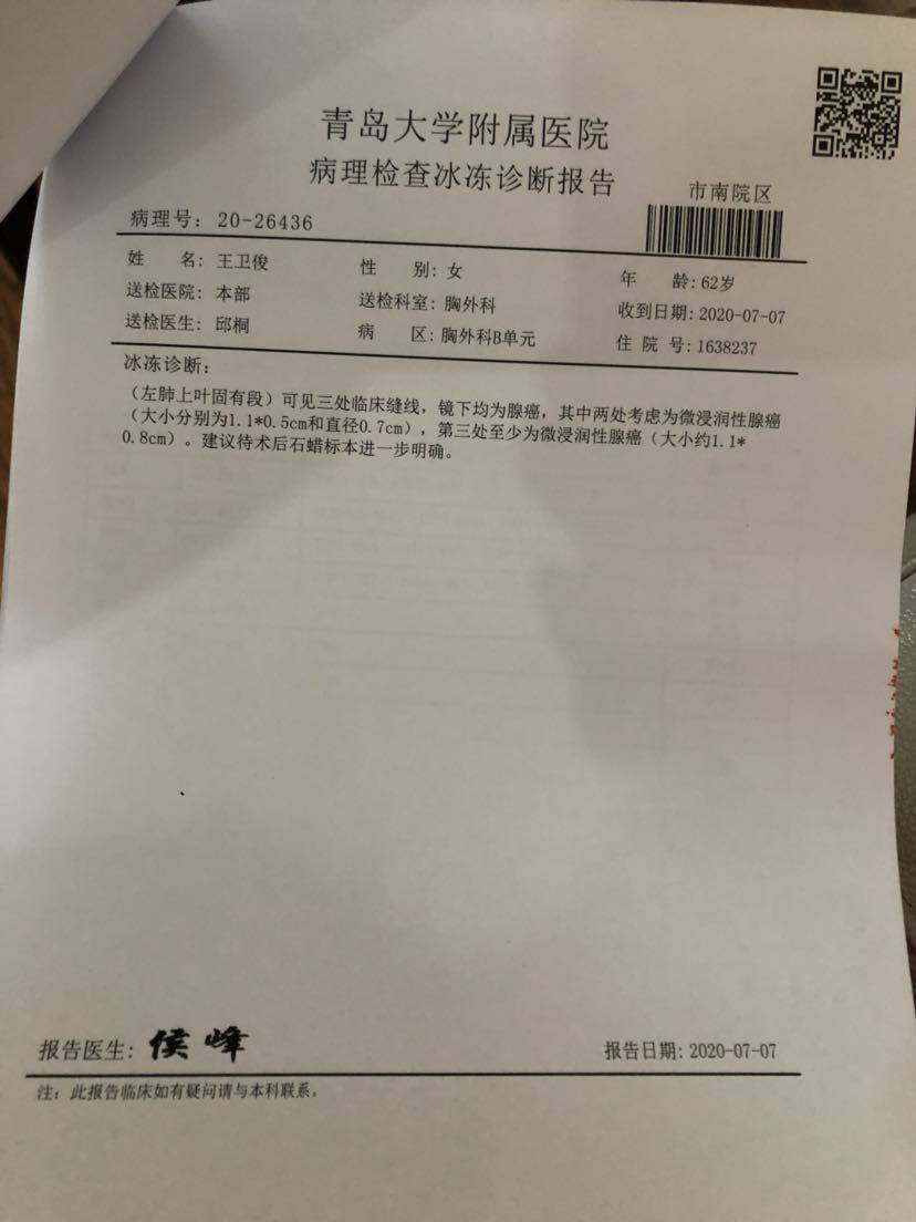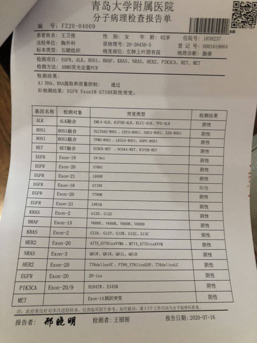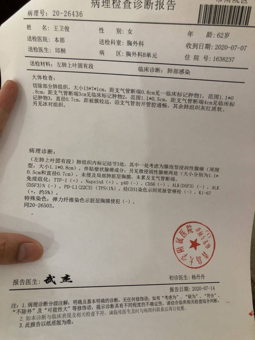 就这样,我们联系到了我们当地最好的医院找了比较有名的胸外科主任,在2020年7月做了左上肺固有段切除手术➕淋巴切除术,手术中切出来三个,比ct看到的多一个,而且都是恶性。病理显示分别是两个微浸润(1.1✖️0.5、直径0.7);一个腺泡型浸润性腺癌(1.1✖️0.8),伴贴壁状腺癌成分,术后病理显示未侵及淋巴结及局部肺脏层胸膜,未累及支气管断端,属于1A2期肺腺ca,基因检测是EGFR Exon-18 G719X 阳性。主刀医生很忙,除了手术前见了一面,后来知道我们出院也没有见到过沟通过。好在术后妈妈恢复的不错,我也认为切掉了没有转移,就达到根治了。可是手术后一个月复查时医生说后续可以继续观察、可以做化疗、也可以吃靶向药,这三个选项让我们自行选择。我一下又陷入恐慌中,做化疗在我的固有认知里是那么强烈的治疗手段,而且,如果需要做后续治疗是不是说明还有复发的可能性?还有一个让我比较纠结的问题,是我用尽力气隐瞒的事实,在这次复查时,被医生说出来了,我妈妈知道了自己的诊断,而她之前真的已经相信只是结节。那段时间我每天故作轻松的安慰她,另一边又整日往返本市的各大医院,每个医生的见解都稍有不同,但是结论基本都是自己决定是否后续治疗。