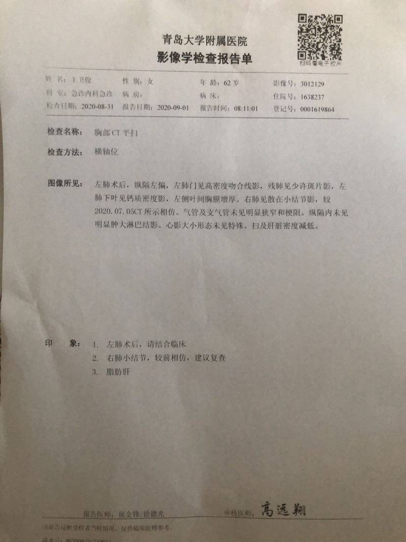 因为我老公本身在医院工作,但不是临床医生,所以当初在他们医院查体后,自行拿回报告,也没有找专门医生去看一看,我也只是看了下大概,因为我妈是结节体质,每年查甲状腺都有好几枚结节,所以误认为肺上磨玻璃结节也是一类的东西,就没有再多加关注。之后因为怀孕,下一次常规体检拖到了一年半之后,这次关于那两枚肺结节的报告,是大小没什么变化,但是有一句话让我顿感惊慌失措:不排斥早期肺ca。当时找到医生,医生说既然没变化,再观察三个月再做一次ct。三月之后的结果就是大小变化不大,但是实性更实了一些,基本判断是早期肺ca,因为考虑是惰性ca,建议择期手术,也可自己决定是否再观察。因为母亲身体一直不错,从没做过什么手术,听医生这种模棱两可的回答,也纠结了一段时间做不做,后来终于下定决心让妈妈接受手术,跟她说的是肺部有个良性结节,位置不好在血管附近,有压迫,所以要手术切掉。妈妈一直是信任我的,虽然也有半信半疑,但是我的话说的斩钉截铁,妈妈虽然有怀疑但也拿不准到底是不是ca。