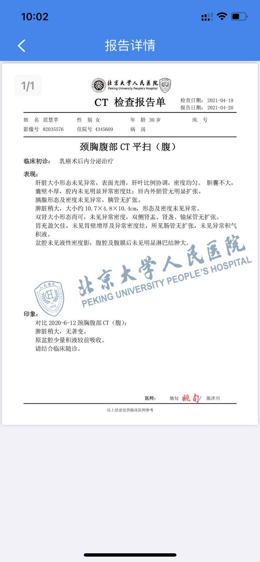 恭喜,你这个CT一下子连胸带腹部都检查了还挺方便的,我们一般胸部CT腹部B超还要约两次,排两次队很麻烦