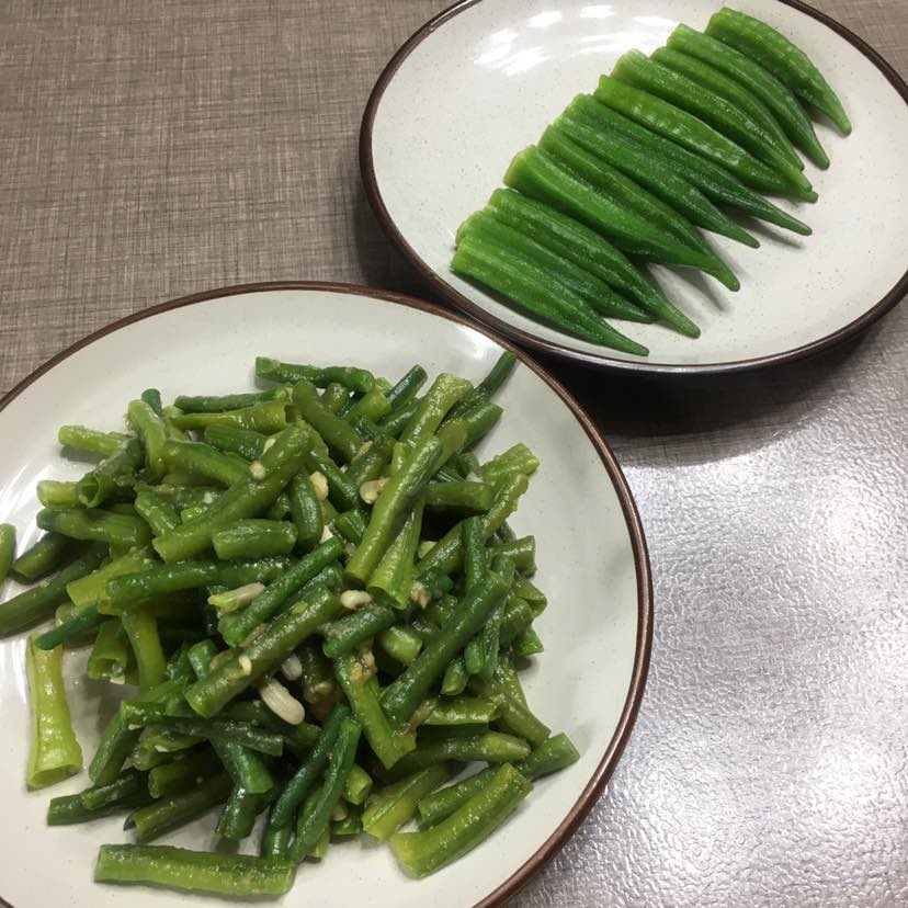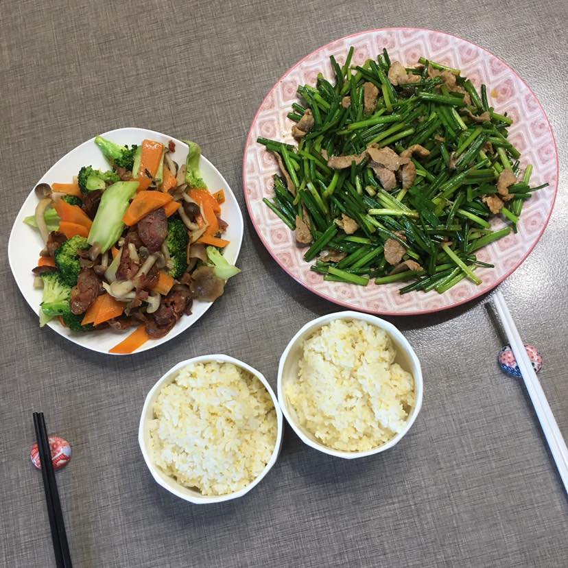 西兰花腊肠炒胡萝卜🥕蟹味菇。韭薹炒肉,小米白饭