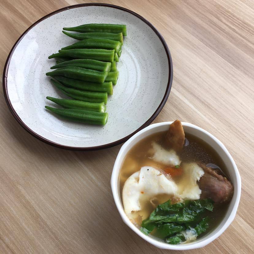 早餐:白灼秋葵,鸡汤生菜荷包蛋