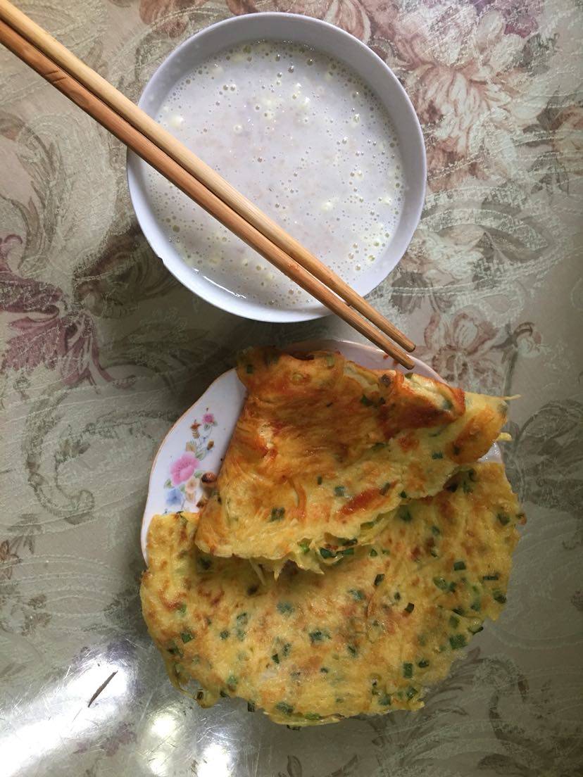 今天的早餐,牛奶麦片粥,土豆丝鸡蛋面粉饼,抹了点蕃茄酱