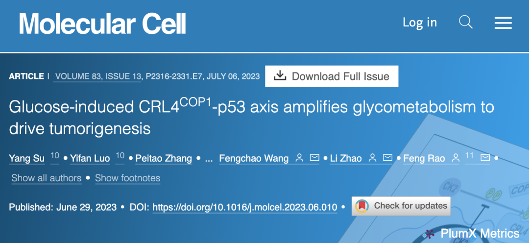 [1]Su Y, Luo Y, Zhang P, et al. Glucose-induced CRL4COP1-p53 axis amplifies glycometabolism to drive tumorigenesis. Mol Cell. 2023;S1097-2765(23)00432-X. doi:10.1016/j.molcel.2023.06.010