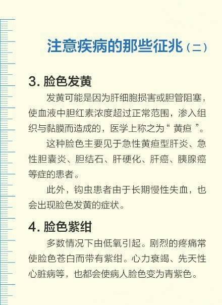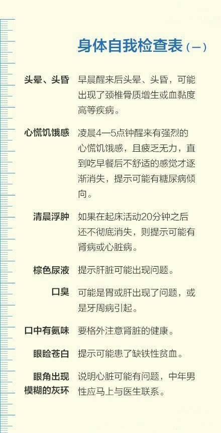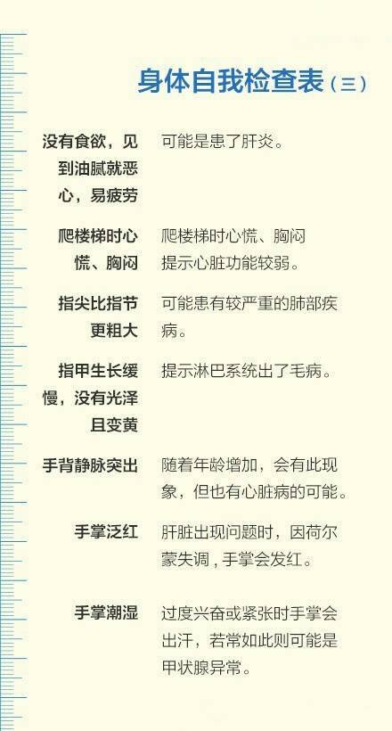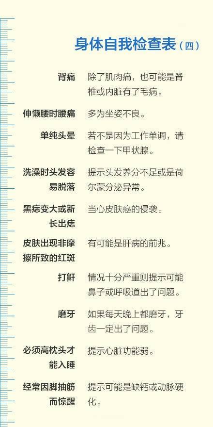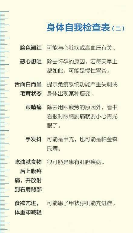 你了解自己的身体健康状况吗?你注意过身体给你的种种健康提醒吗?有些小毛病却从没把它当回事儿?没有食欲,见到油腻就恶心,可能是患了肝炎......别忽视那些身体给你的警告!疾病先兆自查表,供你参考↓↓↓ 戳图对照!