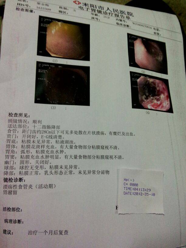 最近人越来越瘦了,越来越不能吃东西了,人就变得越来越不精神了。主要原因还是胃,以为平时有吃中药会慢慢调理起来,结果还是没用,特别是每次吃东西后,就胃痛胃涨胃烧,晚上睡觉也睡不了。就在昨晚,又吐了,老公又不在(他表弟结婚,他昨天回去了,我不一起回去就是因为胃不舒服,不想人家看到我病殃殃的样子)后来老公打电话叫我今天去医院照个胃镜看看,刚开始我不愿意,因为怕照胃镜,但经过昨晚一夜没睡着,熬着到天亮这么辛苦,今天一早就自愿去医院了。一个人去了医院挂了号,看了医生,医生开了胃镜单。我就交钱排队照胃镜了,帮我照胃镜的医生,在照的时候嘴巴就一直啧啧啧,和旁边一起的医生说我好严重(当时里面四个有医护人,助手)当时我眼泪就流出来了。照完了,他问了我很多问题,后面他就说,像我这个情况等下出结果了,去看医生,吃药后半个月再来复查一次!结果出来了,我就拿给医生看了,他二话不说就直接叫我住院,他还说像我这样子不住院的话,糜烂又出血怎么吃得东西下去?当时我就哭了,因为一个人,觉得好无助啊,刚好想给老公打电话手机又没电了