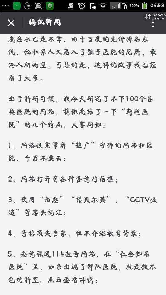 网络不是万能的,有利有弊,我们要擦亮双眼,理清头脑,才能避免这类事情发生。下截图是骗子医院的几个特征,一起分享