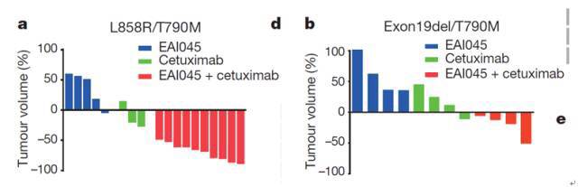 对于这类病人,萝卜上文已经提到,已经有神药AZD9291可以吃了,但这个新药和爱必妥连用,似乎也挺好,在小鼠模型中,有效率高达80%左右(图中红色的就是两药联合的病鼠,柱子朝下就代表肿瘤缩小,纵坐标的数字代表肿瘤缩小的比例)。