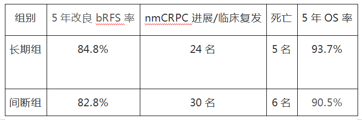 长期组与间断组分别有24名30名患者出现nmCRPC进展或临床复发,5名6名患者死于PCa。