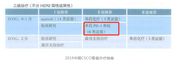 对259例二线治疗失败的晚期胃癌患者予以K药单药治疗的KEYNOTE-059试验中, 结果显示客观缓解率(肿瘤显著缩小的比例)为11.6%,其中PD-L1阳性患者与PD-L1阴性患者相比,胃癌的客观缓解率(15.5% vs 6.4%)和中位缓解时间(16.3个月和6.9个月)都大大提升,说明K药可以在PD-L1阳性胃癌患者中取得更佳的治疗效果,这些研究奠定了K药三线治疗的地位。