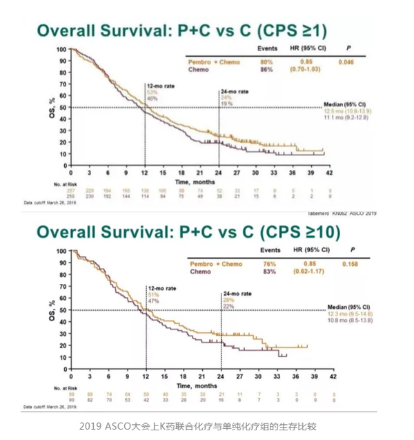 在2019年ASCO大会上公布了KEYNOTE-062试验研究结果,此试验旨在分析比较化疗单药,K药单药,或者K药联合化疗用于晚期胃癌一线治疗的效果。结果K药单药组与化疗组相比,在阳性联合分数CPS≥1人群,K药并未显著改善生存期,但患者耐受性更好;在阳性联合分数CPS≥10人群,K药单药显著改善了总生存期(17.4个月 vs 10.8个月),但无进展生存期(PFS)和客观缓解率却并无改善。