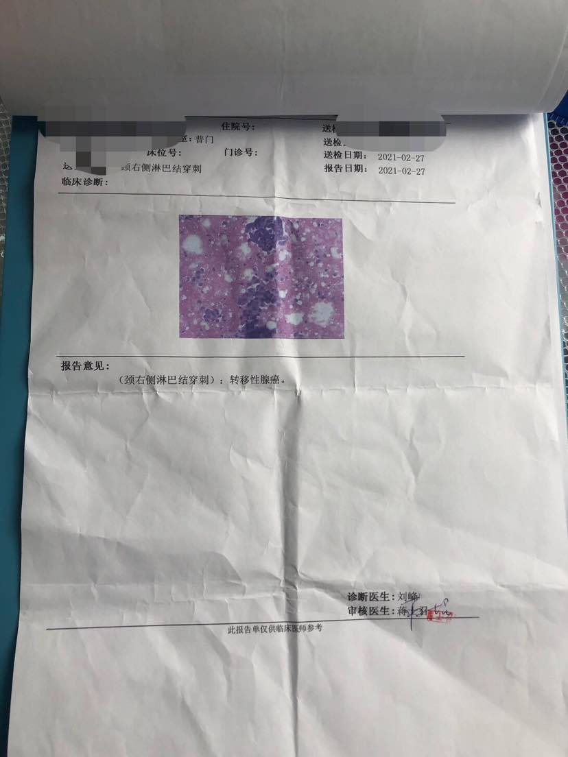 无意中走进了觅友,感谢觅友,让我找到了可以借鉴及交流的地方。2021年注定是不平凡的一年,过完年发现59岁的爸爸,右边脖子和锁骨有肿物,之前状态一直正常,没有耽搁去医院做了穿刺活检,初步结果为转移性腺癌,我顿时就慌了,一直以为离我们很远的疾病,原来一直在身边潜伏。