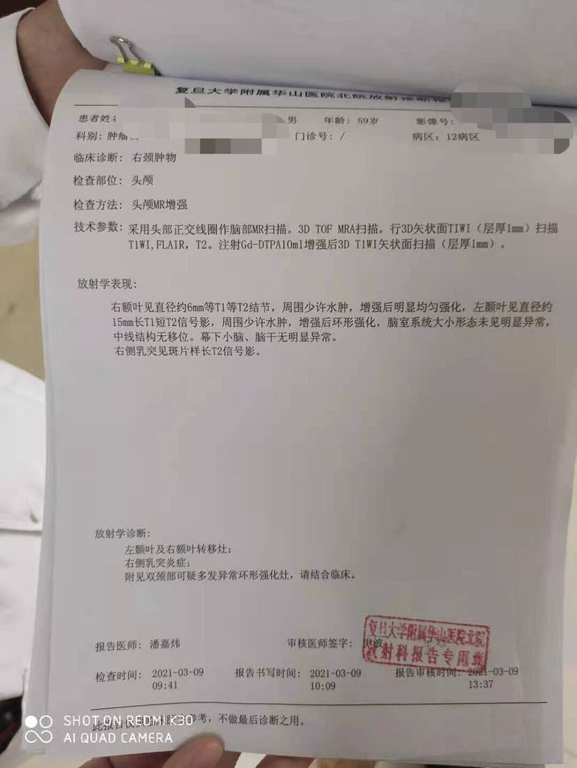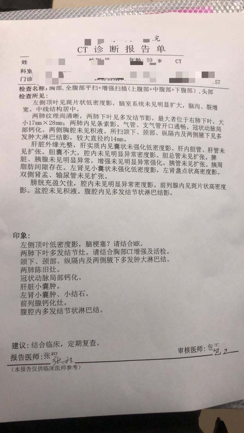 在县城初步检查结果,颈部,腋下,多发淋巴结肿大,肺部多发结节,脑部MR显示转移灶。