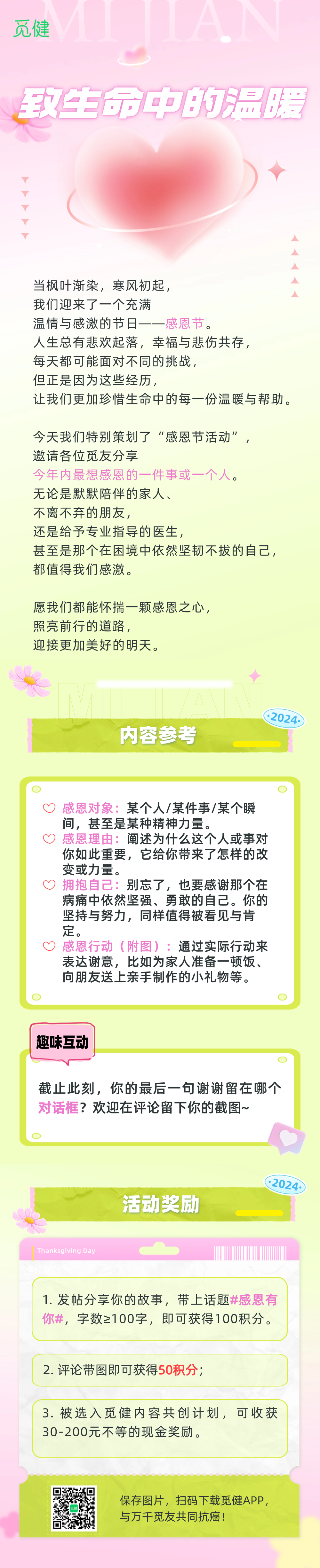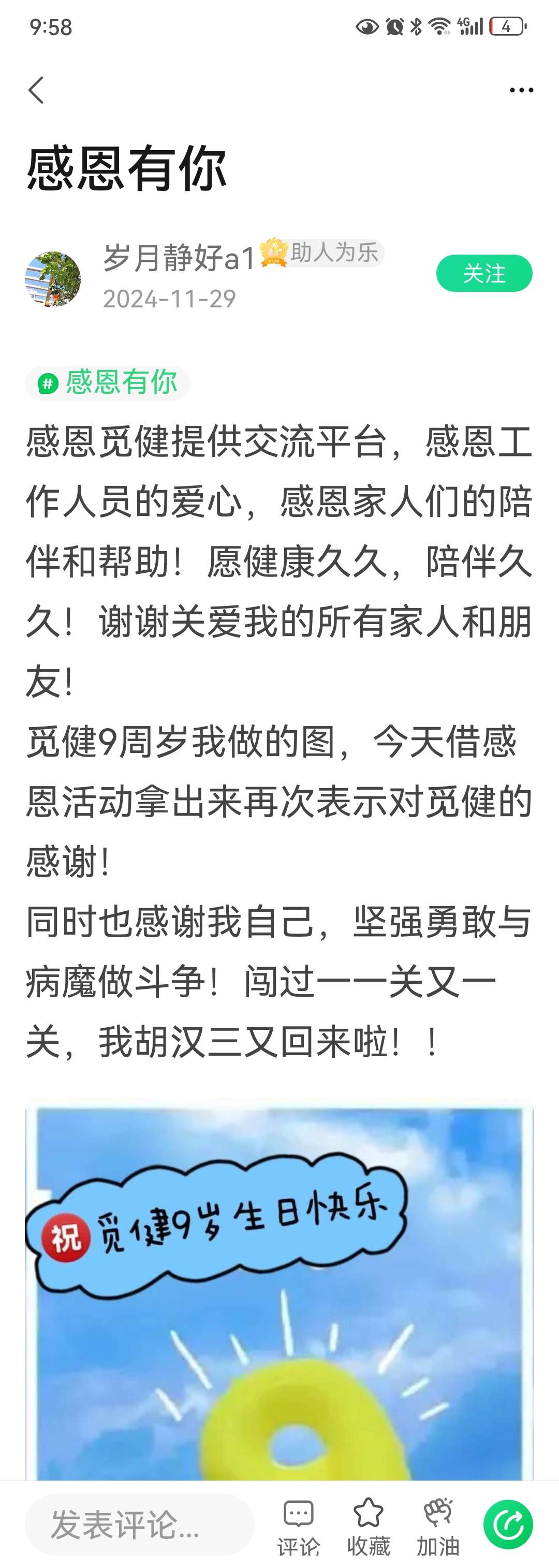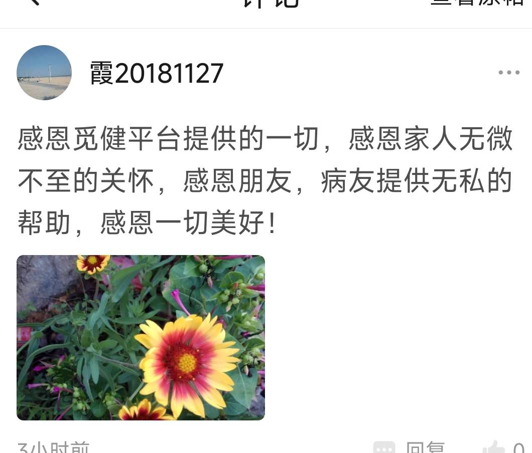 感恩觅健平台提供的一切,感恩家人无微不至的关怀,感恩朋友,病友提供无私的帮助,感恩一切美好!