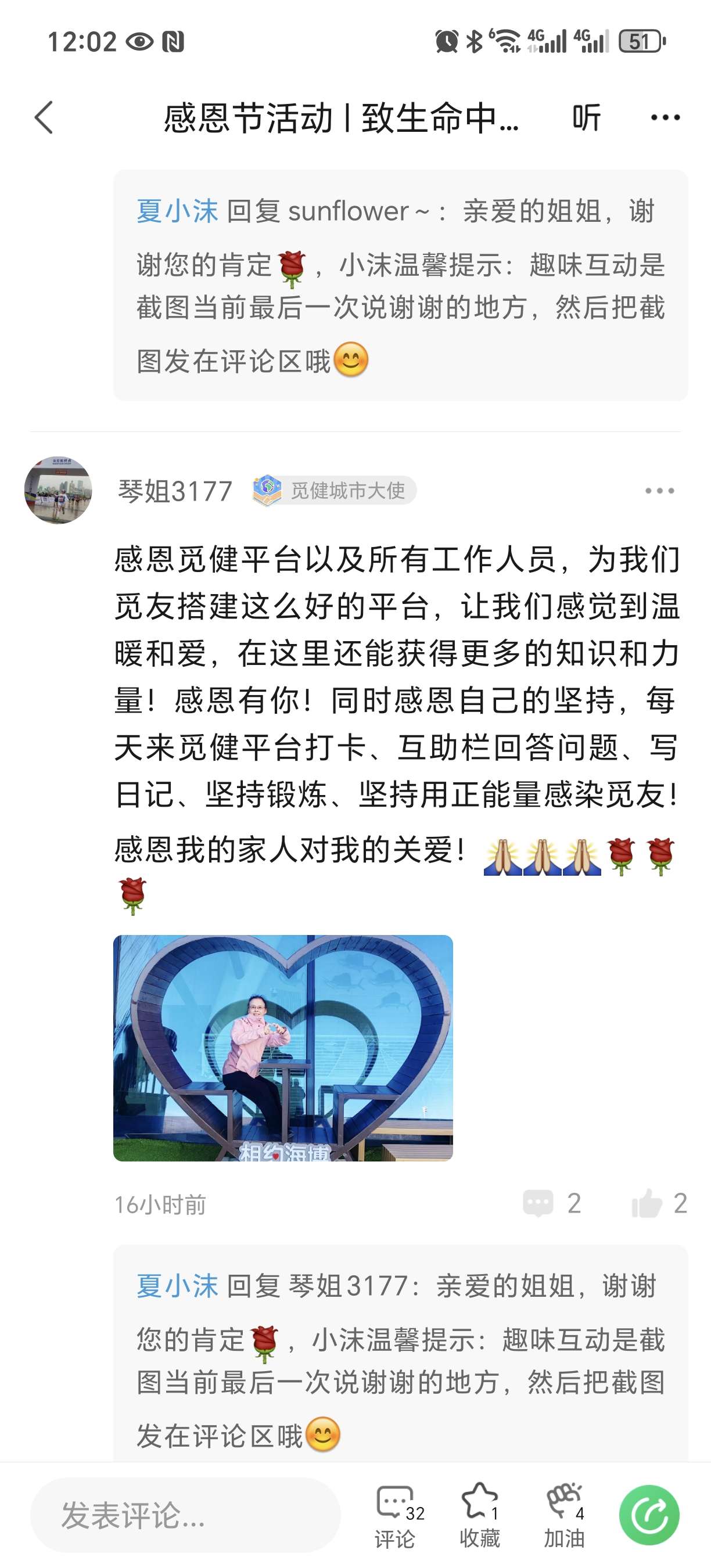 感恩觅健平台以及所有工作人员,为我们觅友搭建这么好的平台,让我们感觉到温暖和爱,在这里还能获得更多的知识和力量!感恩有你!同时感恩自己的坚持,每天来觅健平台打卡、互助栏回答问题、写日记、坚持锻炼、坚持用正能量感染觅友!感恩我的家人对我的关爱!