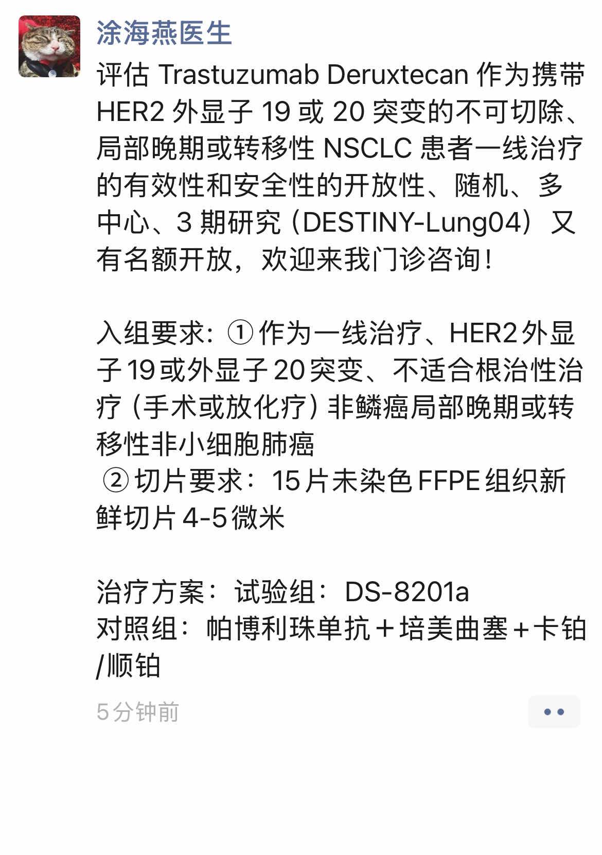 今天看到广东省人民医院的涂海燕主任处又开放了针对初诊her2病友的入组名额,实验组是DS8201,对照组是一线标准治疗,三期临床已经很成熟,有需要的可以看看。涂主任周一周三出诊。
