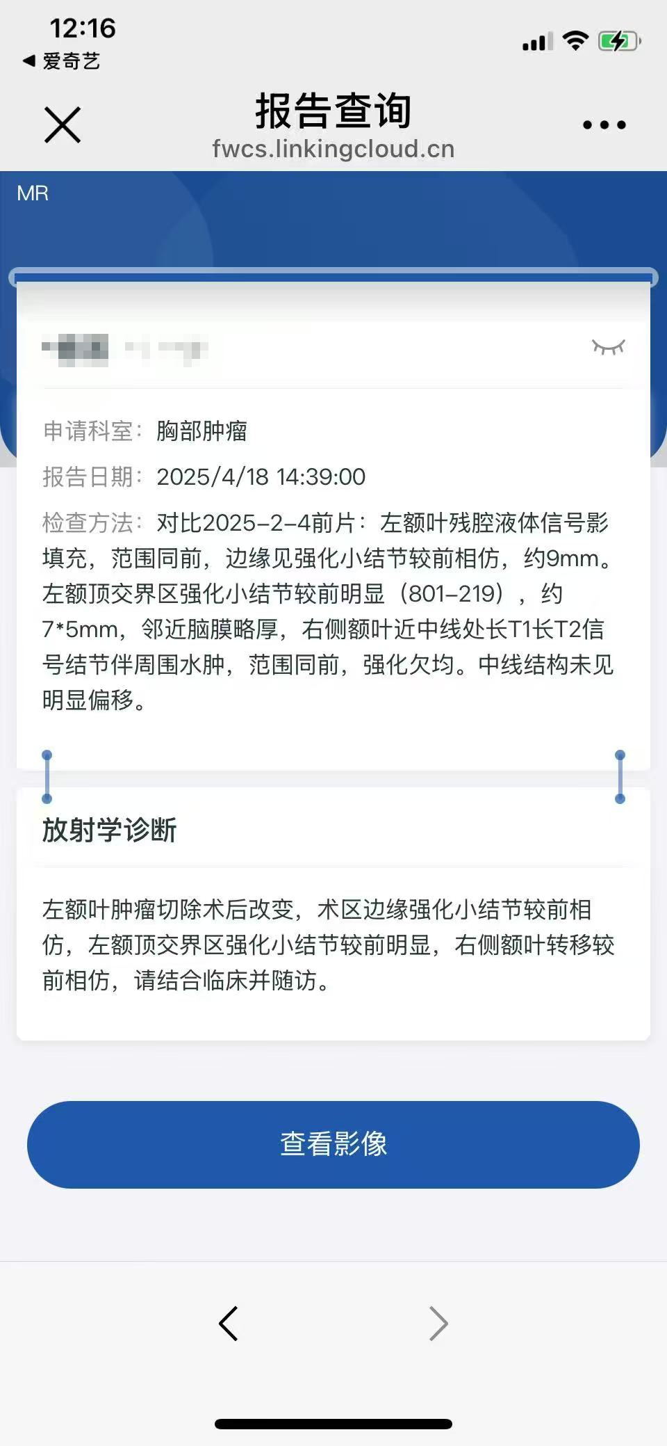 2024 年年前的放疗后,4 月 13 日,语言肢体障碍突然找上门,右侧上臂无力,连手机打字都成了难题。检查发现是放射性脑水肿,4 月 22 日的脑部微创手术切除,不得不暂停奥西替尼。2025 年,手术部位复发,另一处也出现异常增强,面对这接二连三的打击,我凭借顽强的信念,接受伽马刀治疗,誓与病魔抗争到底。