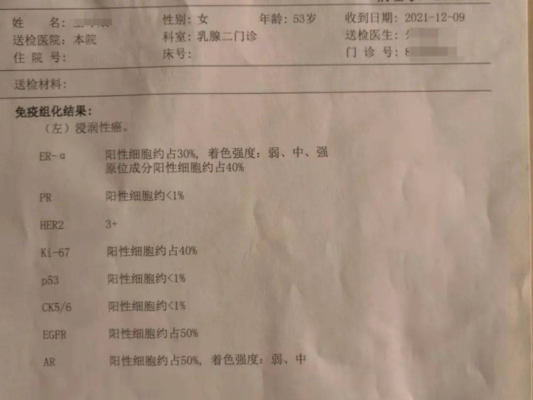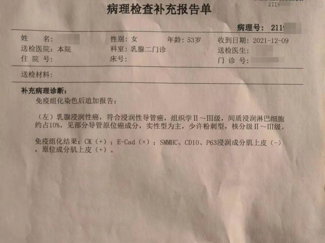 当时在大医院检查完,大医院的大夫都说是良性的,但是最终的病理报告显示是恶性。当时也是因为疫情,辗转了一些时间,最后还是做了手术——是左乳全切术。怎么说呢,现在反正都治疗完了,过去的事情了。