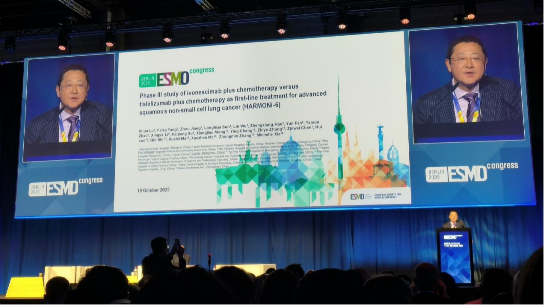 2025年欧洲肿瘤内科学会(ESMO)大会现场传来重磅喜讯——由上海市胸科医院陆舜教授领衔、专门针对晚期肺鳞癌的III期临床研究HARMONi-6数据正式公布!