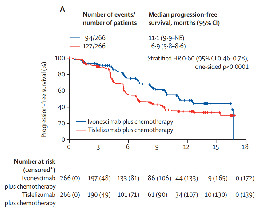 PD-L1 TPS≥1%(阳性)的鳞癌患者:依沃西单抗联合化疗组中位无进展生存期(mPFS)12.6个月,对照组为8.6个月,疾病进展或死亡风险降低34%(HR=0.66);