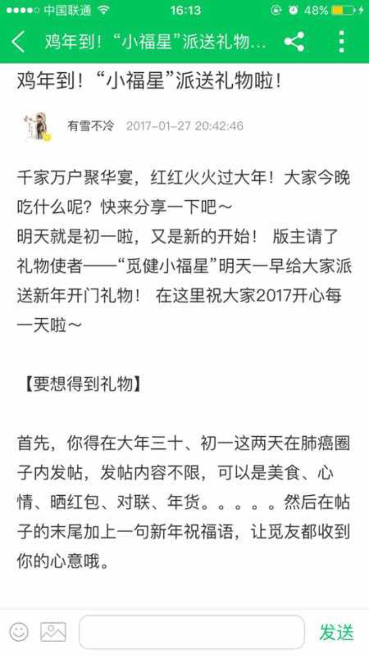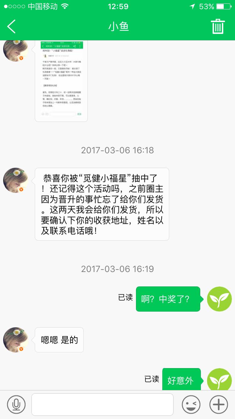 前天收到圈主发来的信息,说我在新春祝福的活动中中奖了,老实说真的很意外,其实我是没有注意看还有活动的,只是单纯的发一个老妈的最近状态。上次也是发帖被列为精华帖,还赠送了30块话费,开始还以为是谁给冲错了,圈主威武