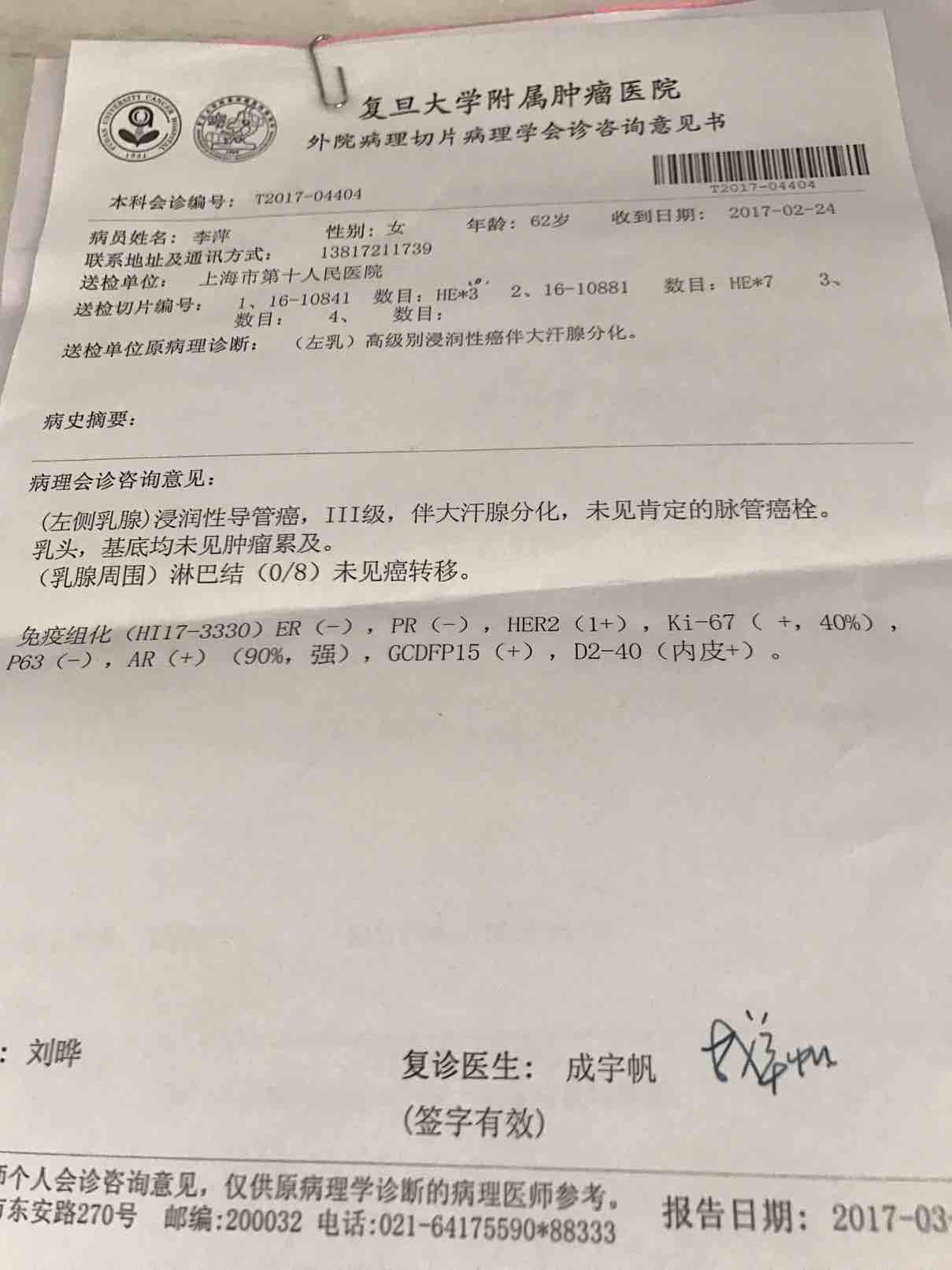 三阴,但不知道是穿刺切片还是肿块大标本的病理,两者结果有可能不同
