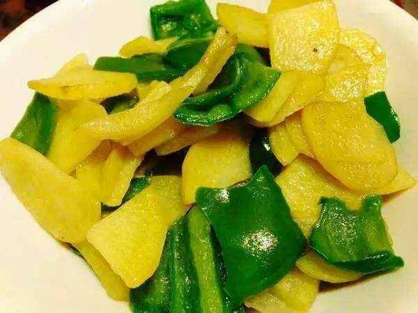 5.锅烧热倒入油,大火加热,待油6成热的时候,放入青葱和蒜片炒香,放入土豆片和青椒翻炒2分钟,加入盐搅匀即可。