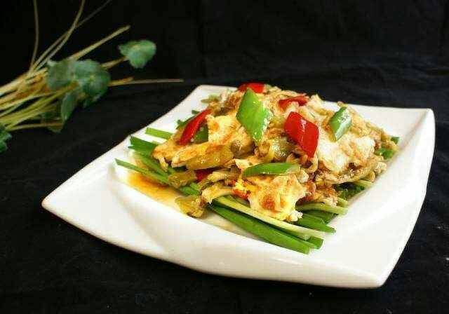 4.原炒锅再把菜椒炒熟,把鸡蛋倒入炒锅中炒散即成。
