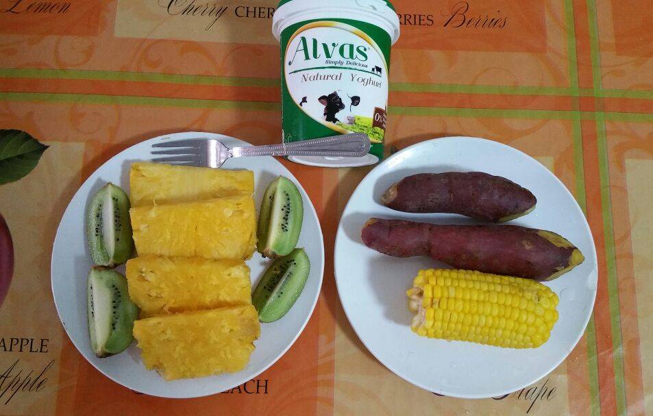 今晚懒神附体😝...随便吃点儿:水果,红薯,玉米,低脂原味酸奶。