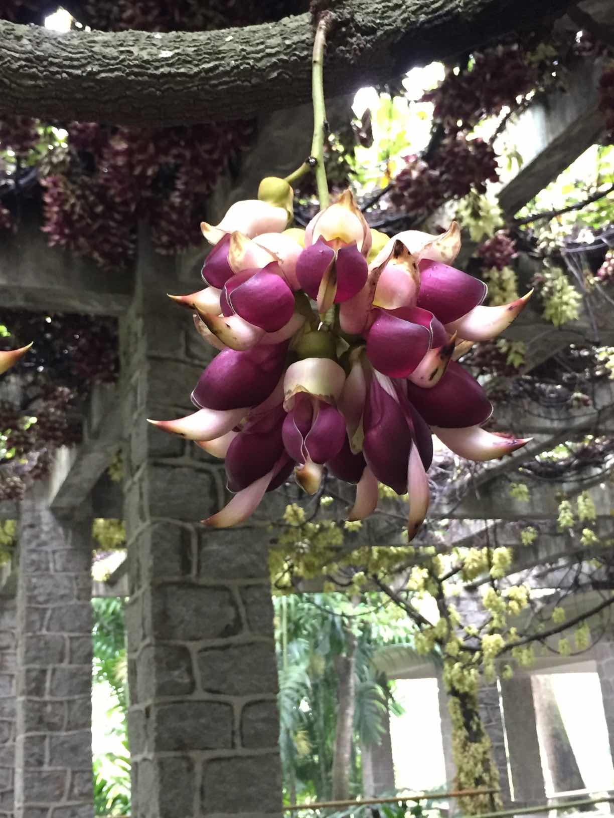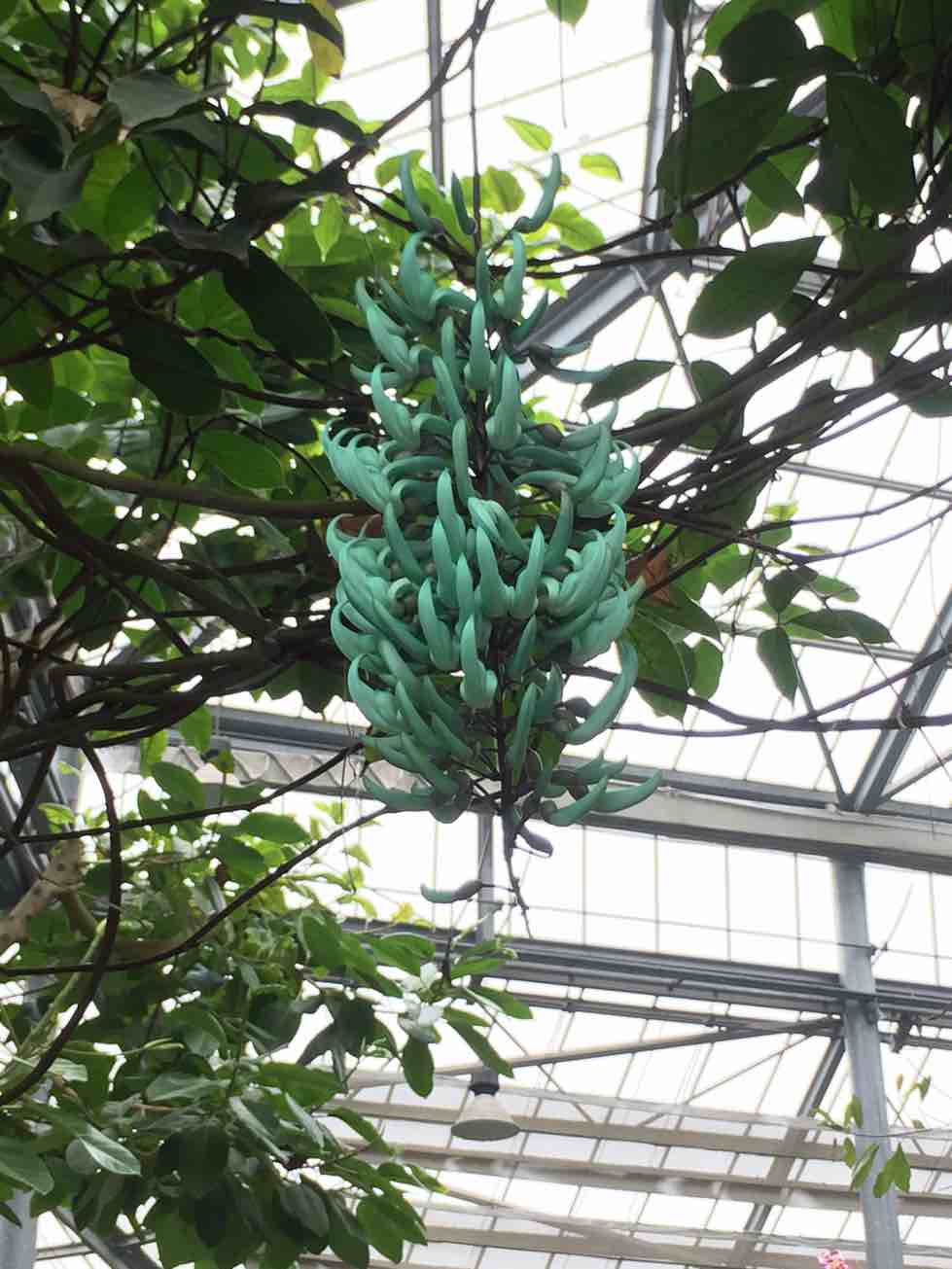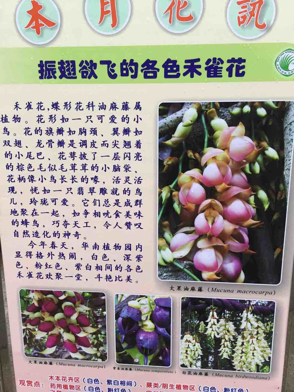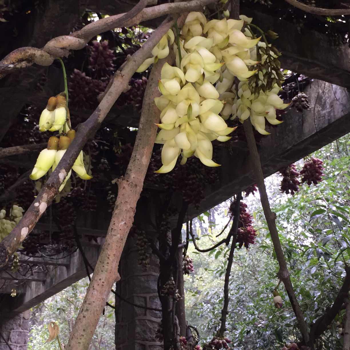 禾雀花多数是黄色花蕊跟紫红色花蕊,华南植物园还有一个特别的品种是翡翠绿色的,叫翡翠葛,是从菲律宾引进来的。