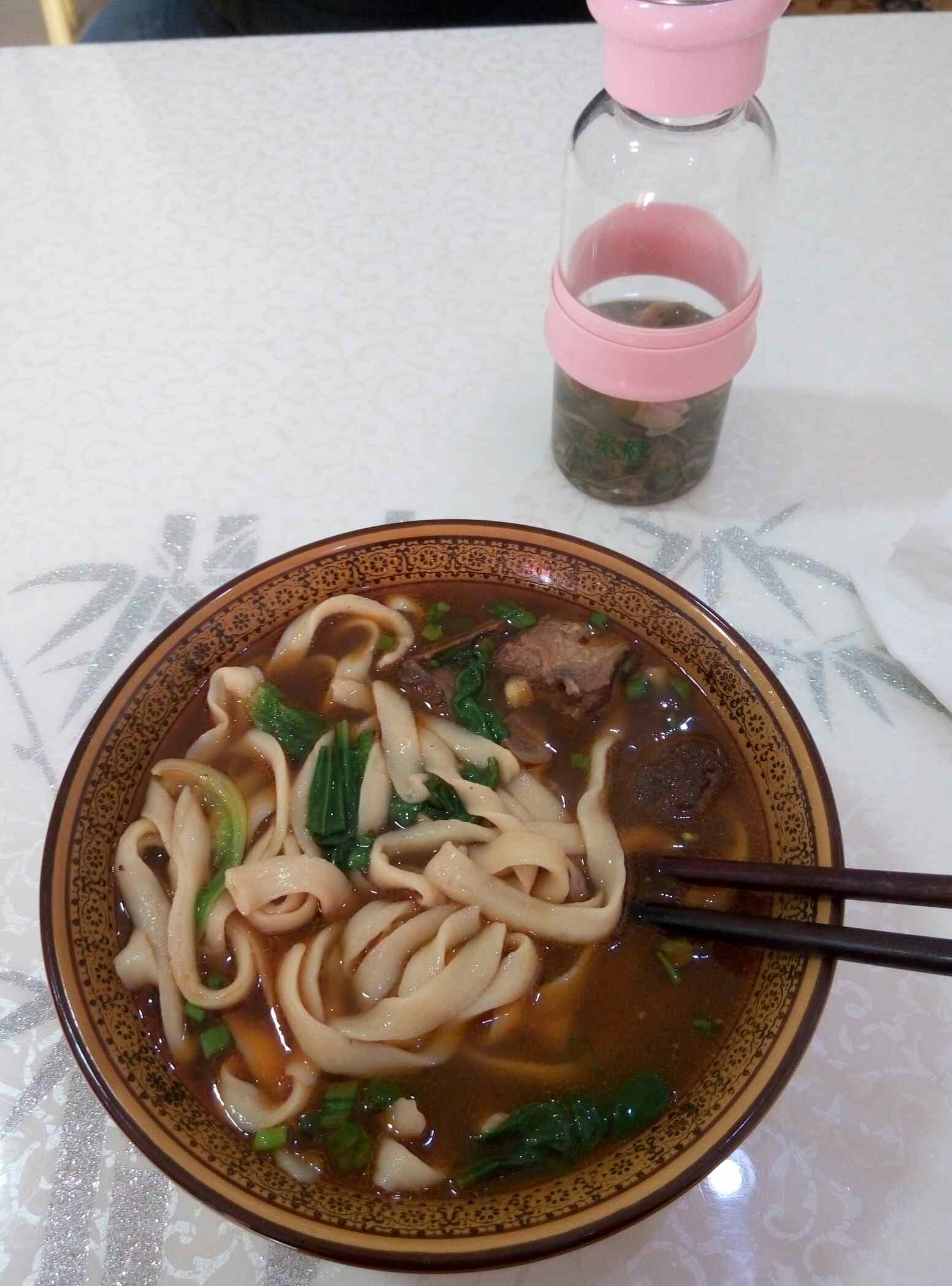 今早上班换外套了,忘记把钥匙装口袋,中午回家开门时才发觉忘记带钥匙了,不想去老公单位拿钥匙,他中午不回家吃饭。只好把买好的菜放在老乡开的粮油店里,下午下班再去取。中午在小区市场的面馆吃了碗刀削排骨面,味道不错!