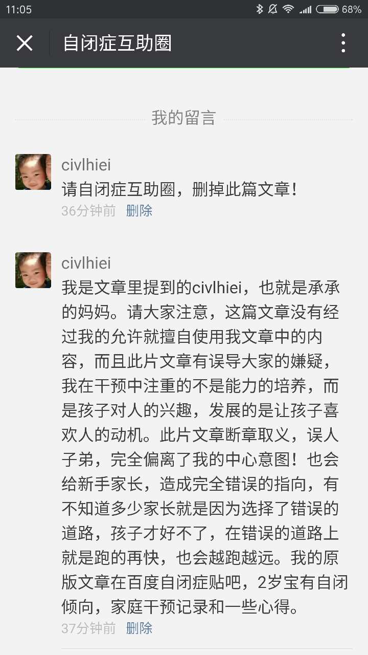 自闭症互助圈发表的一篇文章《核心技能训练对孩子产生的改变(真实记录)》其中引用了我干预承承日记中的一部分,现在澄清,这篇文章不代表我的本意。
