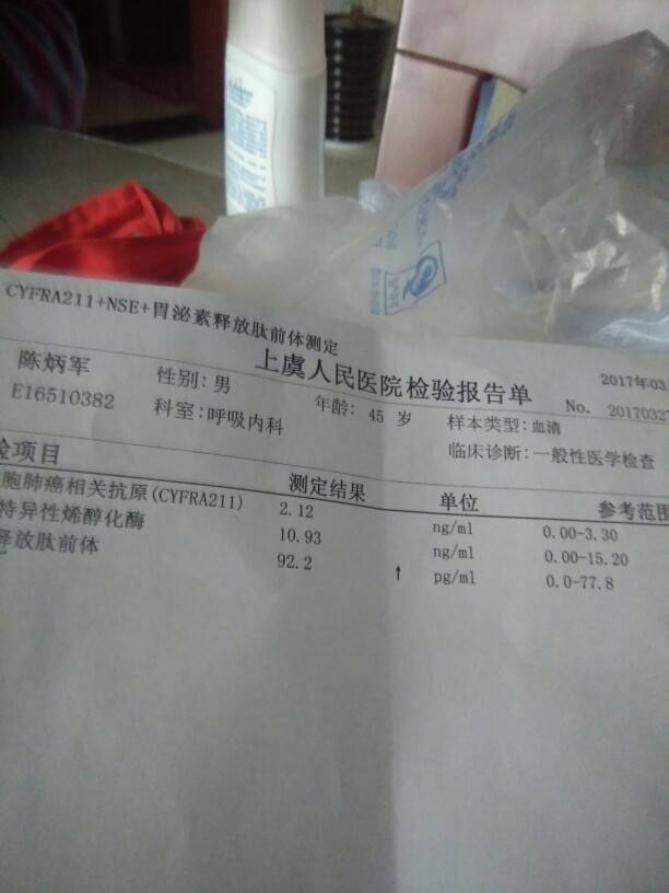 这张报告单,肺癌相关抗原倒是在正常值,但胃泌素释放肽前体高出正常值,提示小细胞肺癌的可能。不过也有少数良性疾病也会导致其升高,请抓紧排查不得延误!