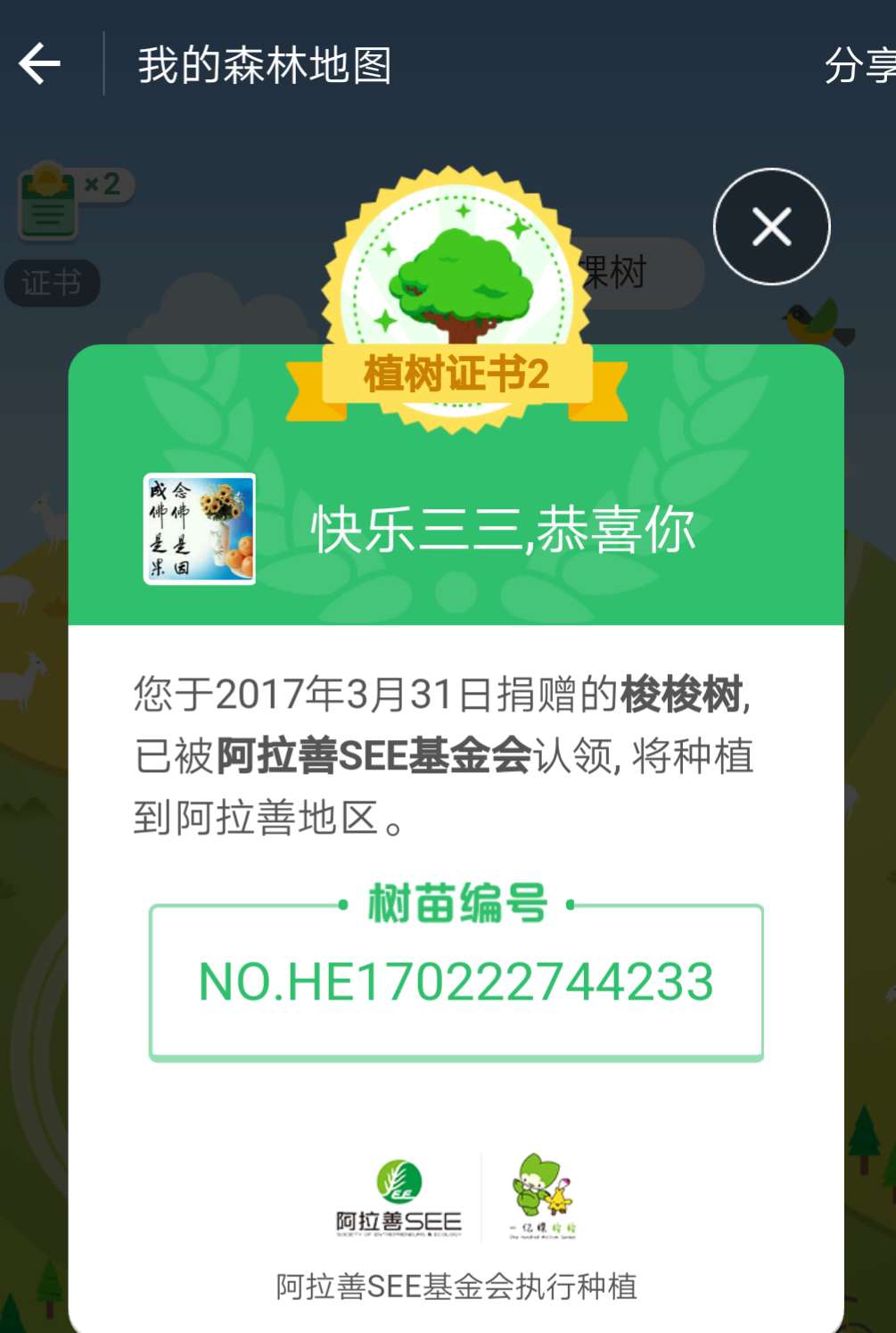 (坚持每日行走,通过支付宝捐赠给阿拉善地区的第二棵梭梭树树认领成功,阿拉善将种植一亿棵梭梭树,通过支付宝已种植一百多万棵了,庆幸其中有我认领的两棵了,继续坚持每日行走,强身健体与公益活动两不误,以自己微薄之力做自己力所能积的事,让第三棵、第四棵……甚至更多棱棱树在阿拉善沙漠扎根、发芽,有生之年我一定要去阿拉善看看认领的梭梭树)