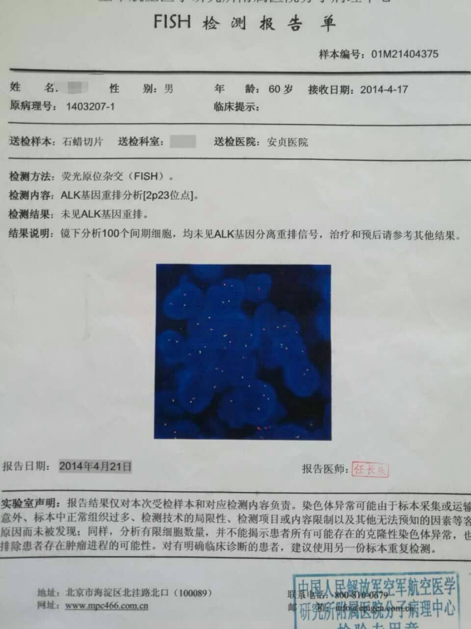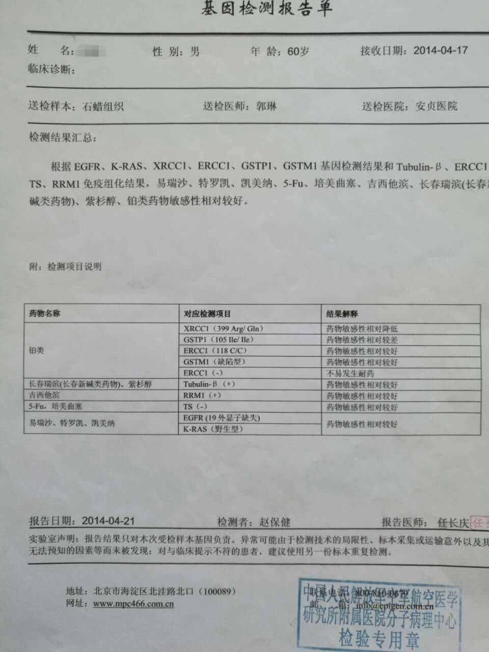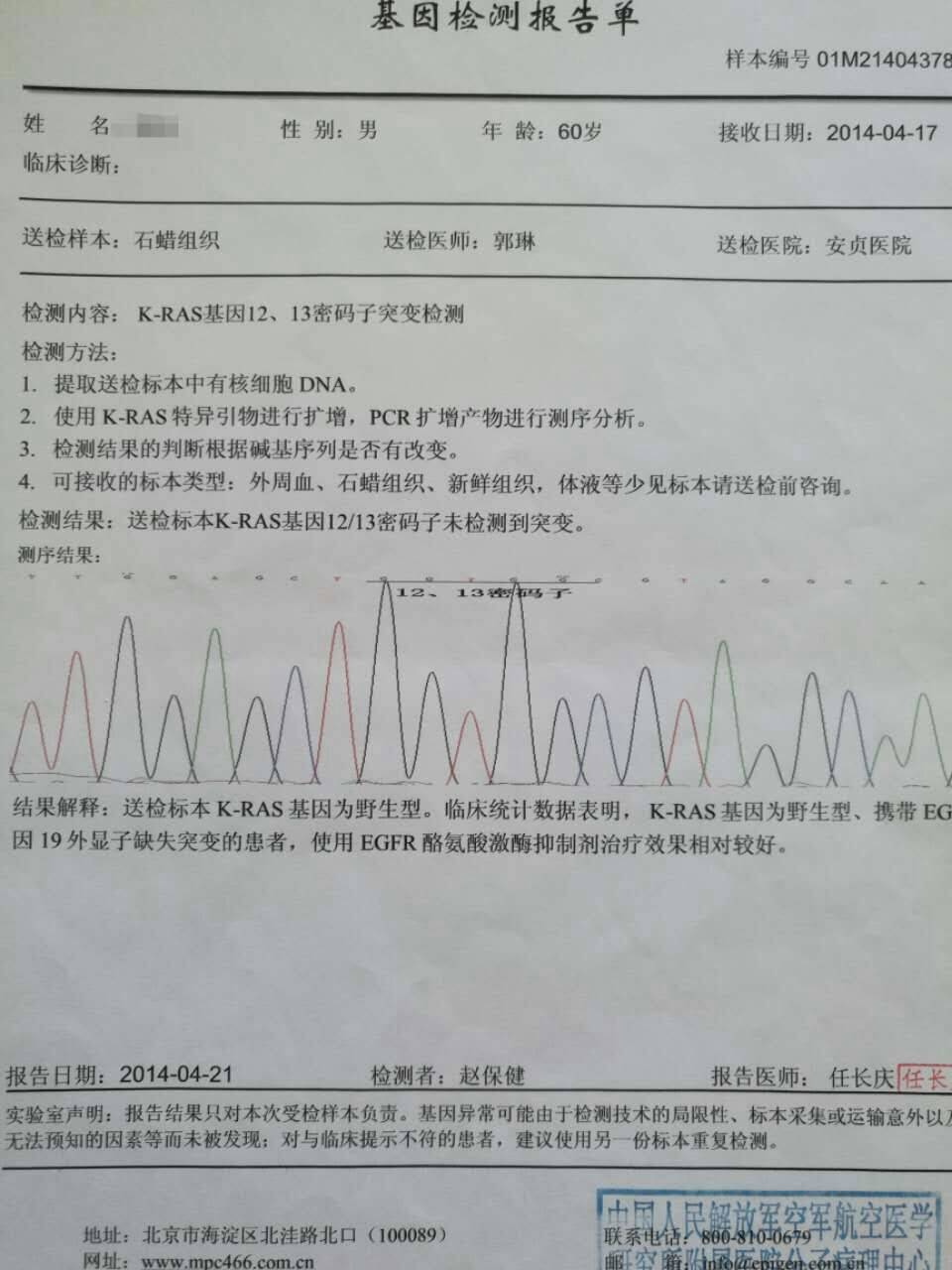从3月22日开始试吃阿法替尼10天,今天去肿瘤医院抽血化验,做腹部、颈部、锁骨上、腋下和腹股沟淋巴结+颈内静脉B超。B超没发现什么异常,生化血常规还行,肿标NSE18.09,其它都还可以,就是CEA又上升89.55(3月16日CEA是81.46),2月6日CEA是48.90(这是另外医院化验的可能有误差)。我和老头都年龄比较大了,虽然在觅健里学到了不少知识,但是有好多也看不懂,我把老头的基因检测拍照下来请觅友们帮助分析,下一步该怎么治疗?给预帮助,万分感谢!