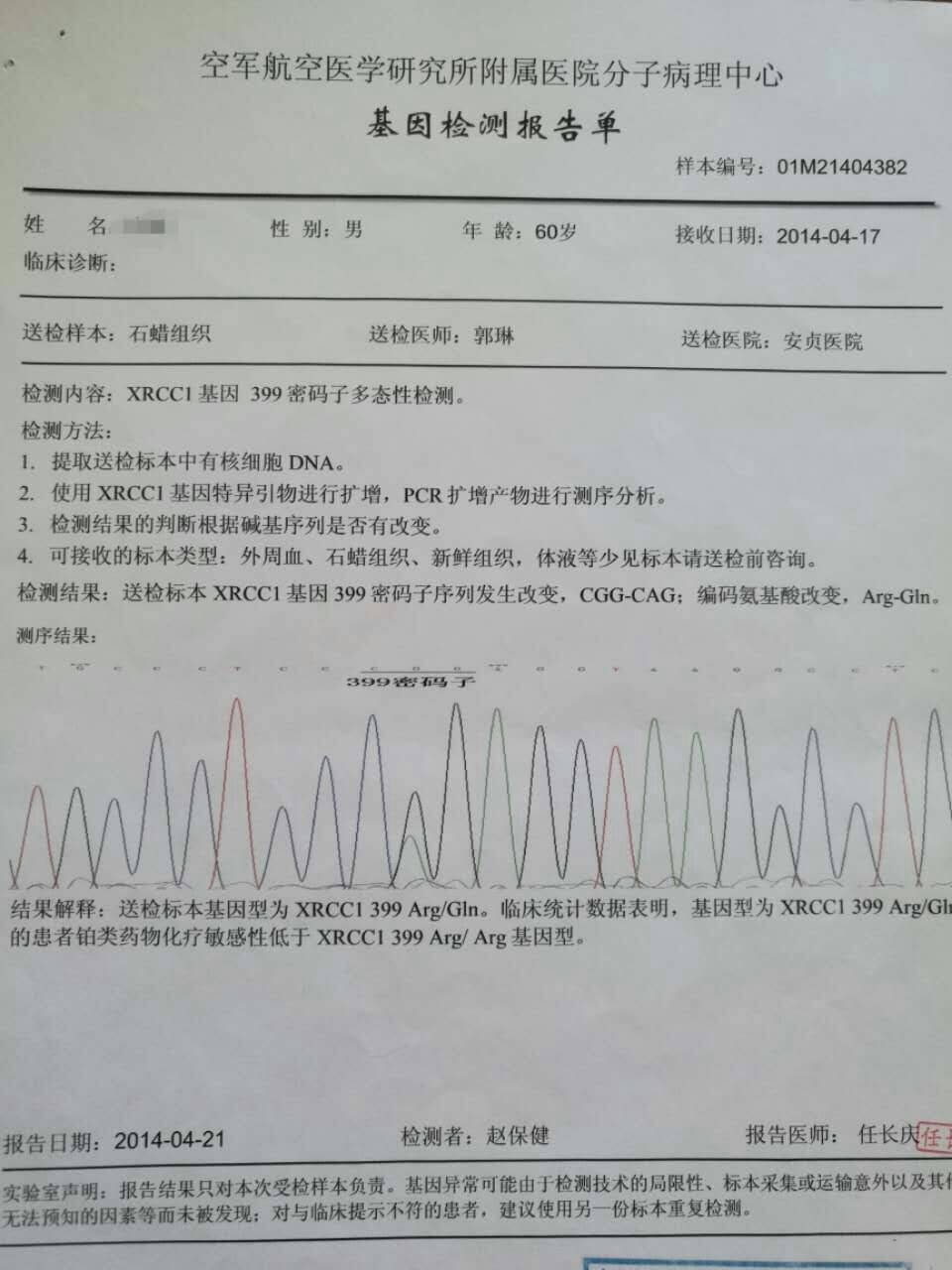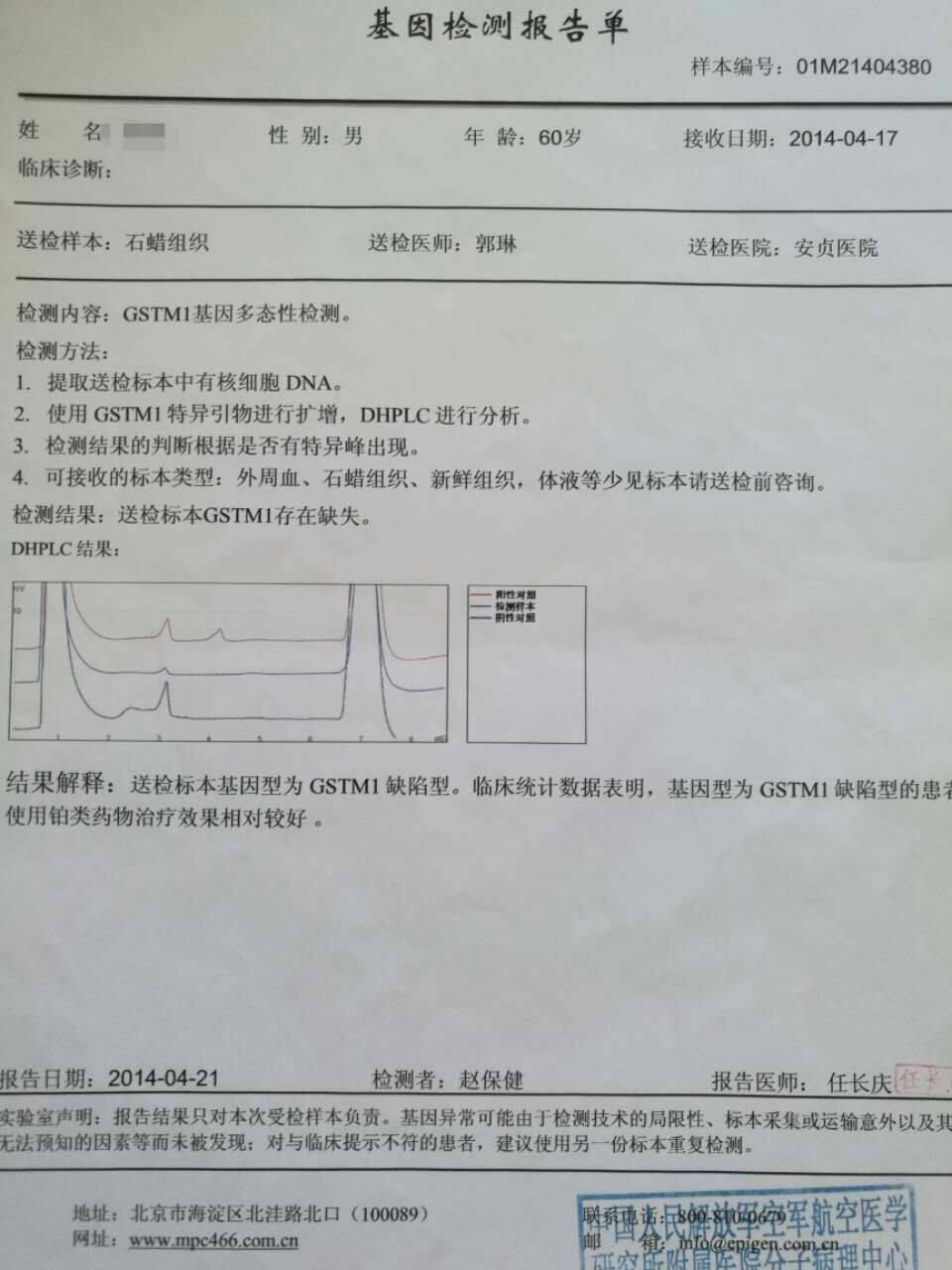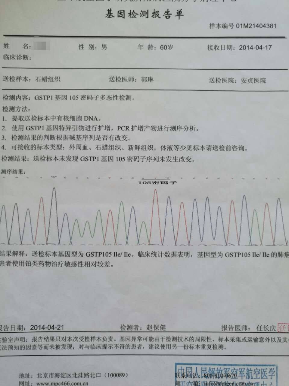 从3月22日开始试吃阿法替尼10天,今天去肿瘤医院抽血化验,做腹部、颈部、锁骨上、腋下和腹股沟淋巴结+颈内静脉B超。B超没发现什么异常,生化血常规还行,肿标NSE18.09,其它都还可以,就是CEA又上升89.55(3月16日CEA是81.46),2月6日CEA是48.90(这是另外医院化验的可能有误差)。我和老头都年龄比较大了,虽然在觅健里学到了不少知识,但是有好多也看不懂,我把老头的基因检测拍照下来请觅友们帮助分析,下一步该怎么治疗?给预帮助,万分感谢!