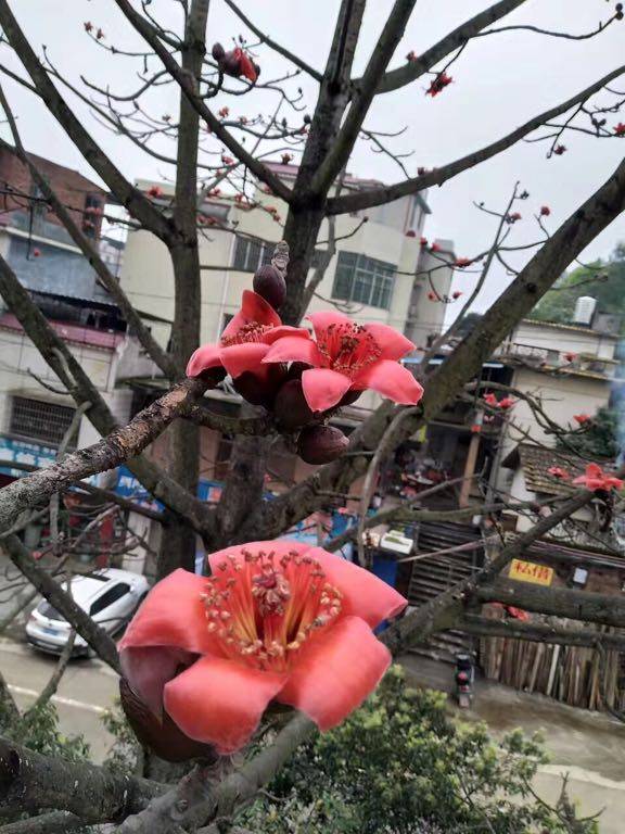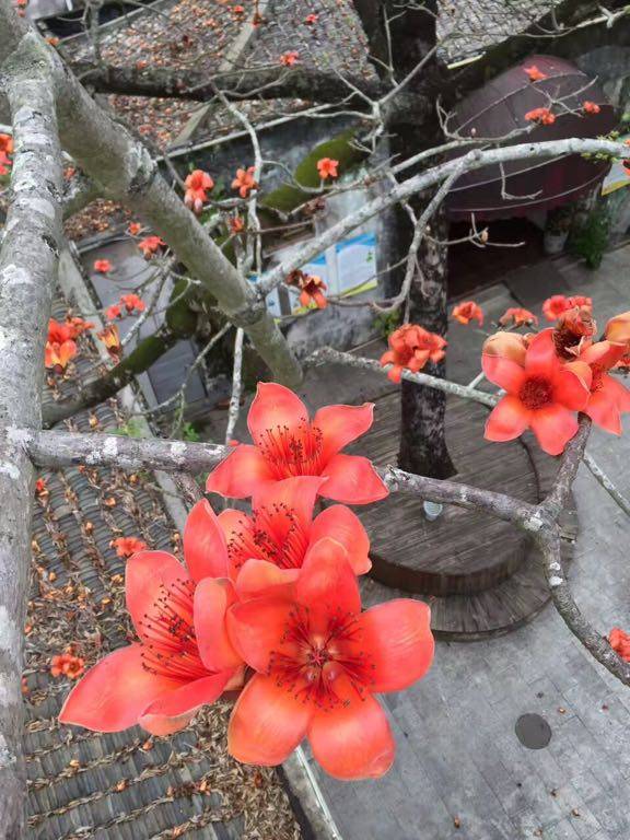 木棉花(kapok)是南方的特产,盛开在三、四月份,是广州市、高雄市以及攀枝花市的市花。花掉落后,树下落英纷陈,花不褪色、不萎靡,很英雄地道别尘世。木棉花为什么叫“英雄花”?因为它开得红艳但又不媚俗,它的壮硕的躯干,顶天立地的姿态,英雄般的壮观,花葩的颜色红得犹如壮士的风骨,色彩就像英雄的鲜血染红了树梢。木棉花,中药名。为木棉科植物木棉的干燥花。春季花盛开时采收,除去杂质,晒干可入药。其功效:健脾祛湿,凉血止血,润肺止咳。木棉花具清热利湿、解毒止血之功效,陈皮和蜂蜜能润肺止咳,粳米能健脾益胃。三者合用,更增加健脾利湿和润肺止咳的功能,对年老气虚者尤为适用。小区附近开放式公园种有好几棵,响应北京老太倡议,随手拍了几张图片,百度了一下,与北方的姐妹们共同悦赏。