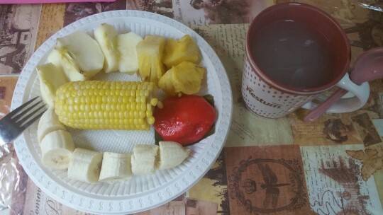 玉米,凉糕,水果,麦片~周末愉快! 🌞