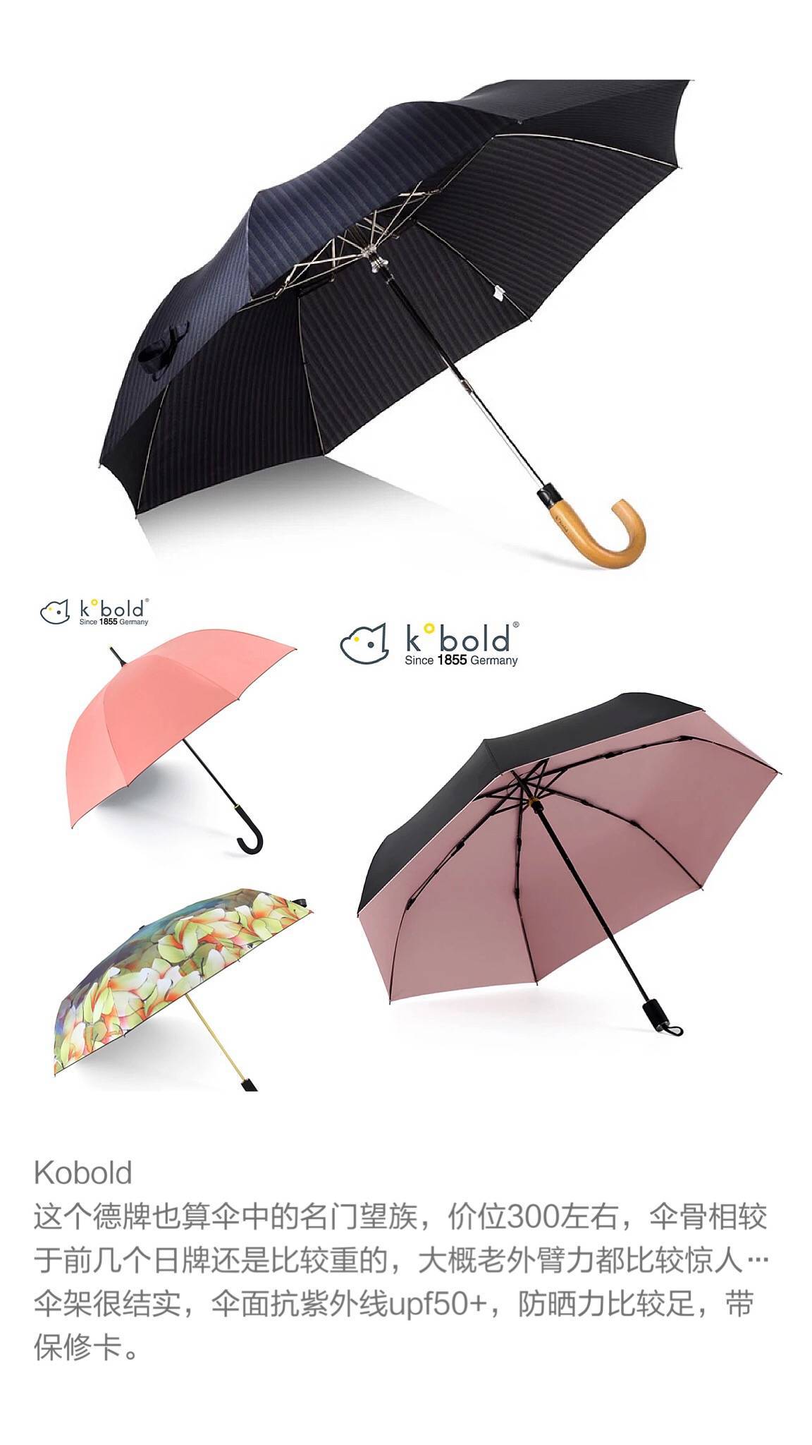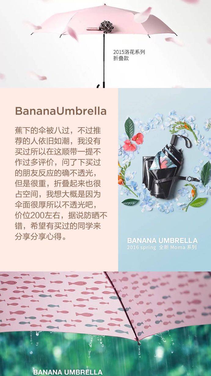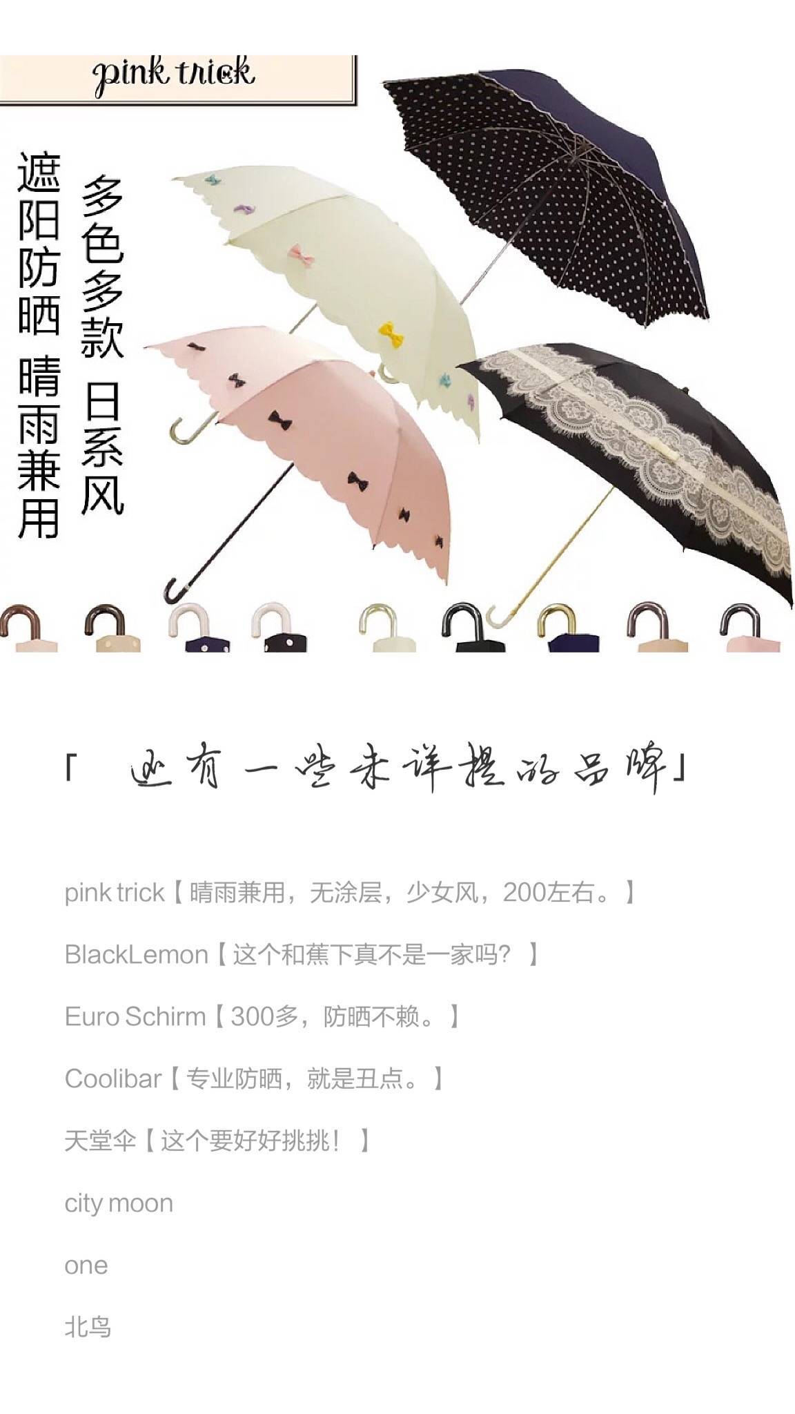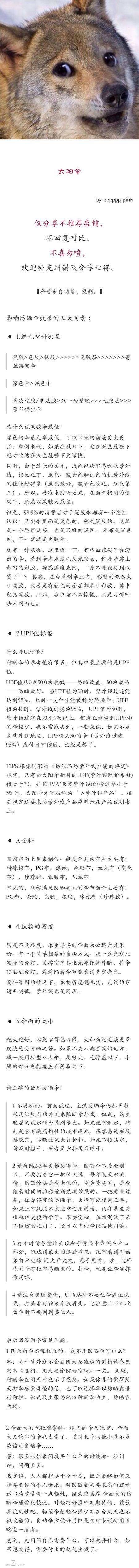 转自微博博主@ppppp-pink,她主要介绍好的防晒伞的标准有哪些和她推荐的一些牌子,在夏天来临之际,希望这些知识能帮到大家选到合适的真正防紫外线的伞,毕竟我们不能晒太阳,对紫外线要更加注意一些…另外考虑到有地面反射、散射紫外线的情况,可以配合防晒霜、口罩等加强防晒效果。