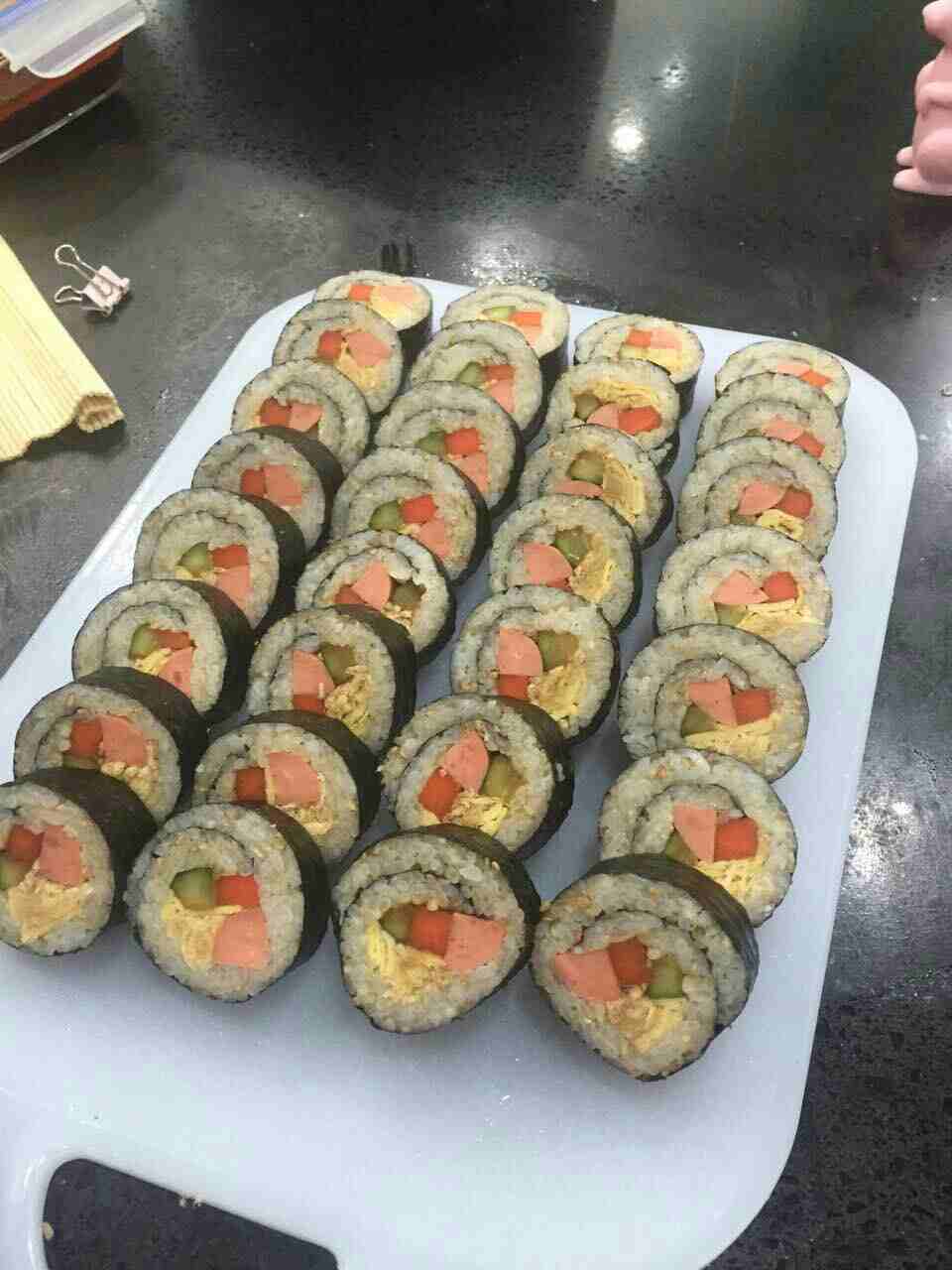 寿司。 材料:醋 酱油(1/3)腌制黄瓜 胡萝卜(出水)蛋皮 火腿 肉松(黑旗牌)
