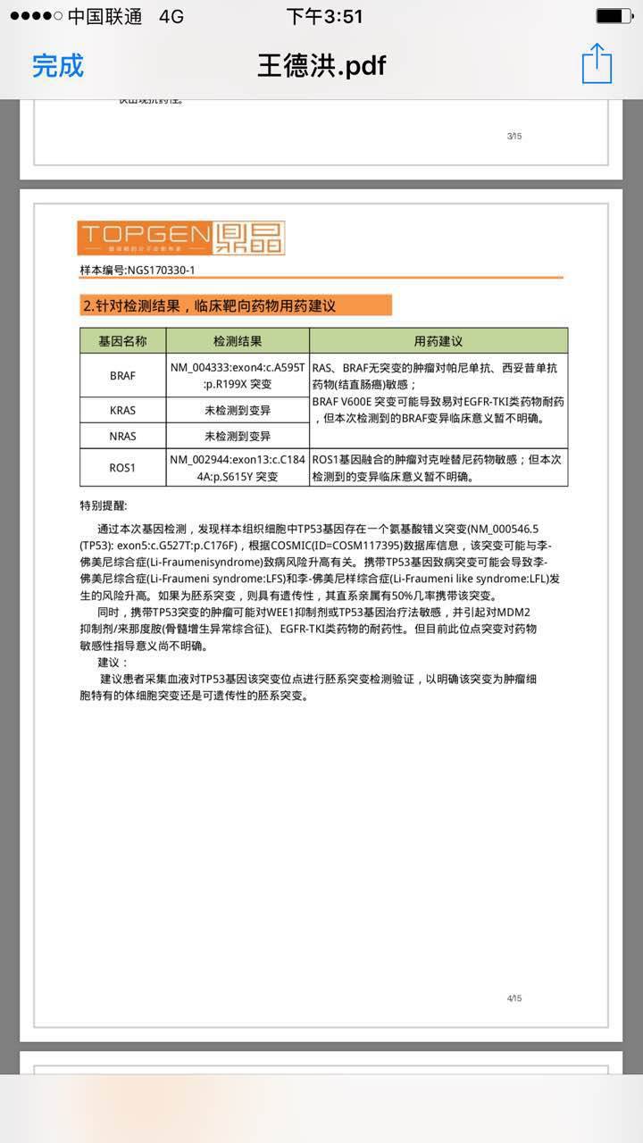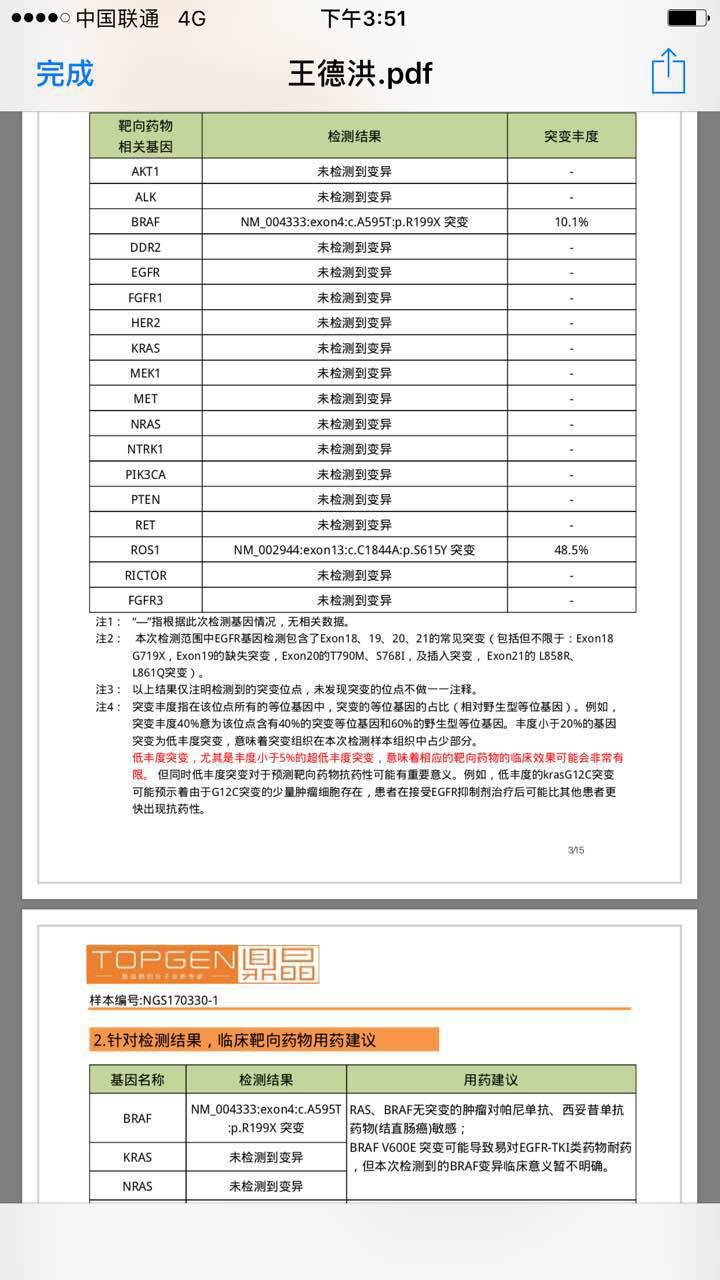 你们做的是什么检测 穿刺 还是血液 结果没有问题的话看突变丰度 BRAF和ROS1突变丰度都大于5% 应该可以用对应的靶向药 BRAF靶点可以威罗菲尼 达帕菲尼 瑞格菲尼 多吉美 ROS1靶点克唑替尼 AP26113 LDK378
