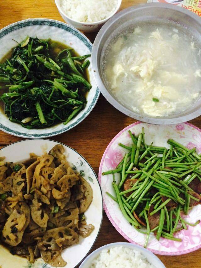 吃中饭喽,藕,空心菜,腊肠炒芦蒿,萝卜丝鸡蛋汤~吃个精光,好吃~😍
