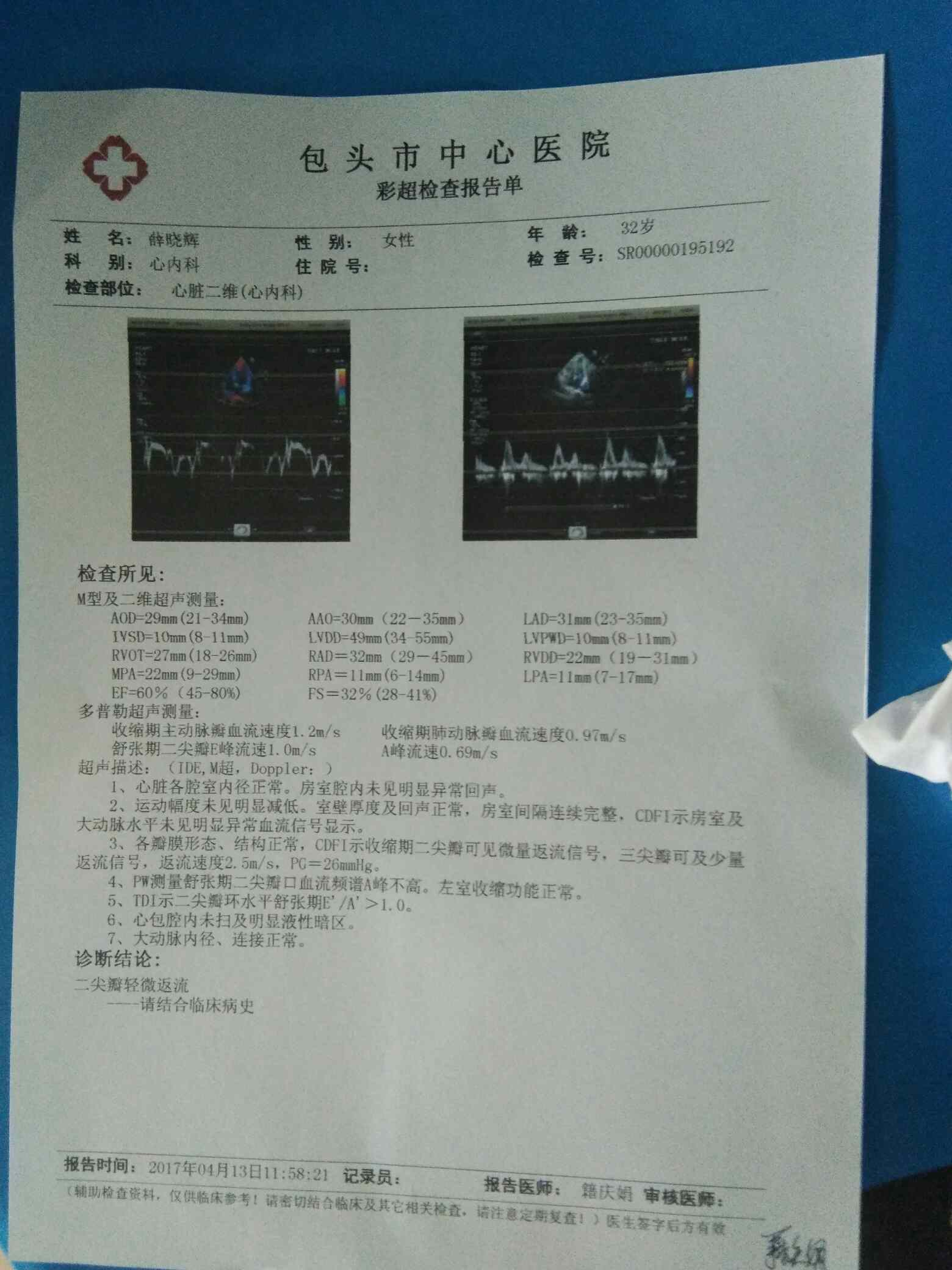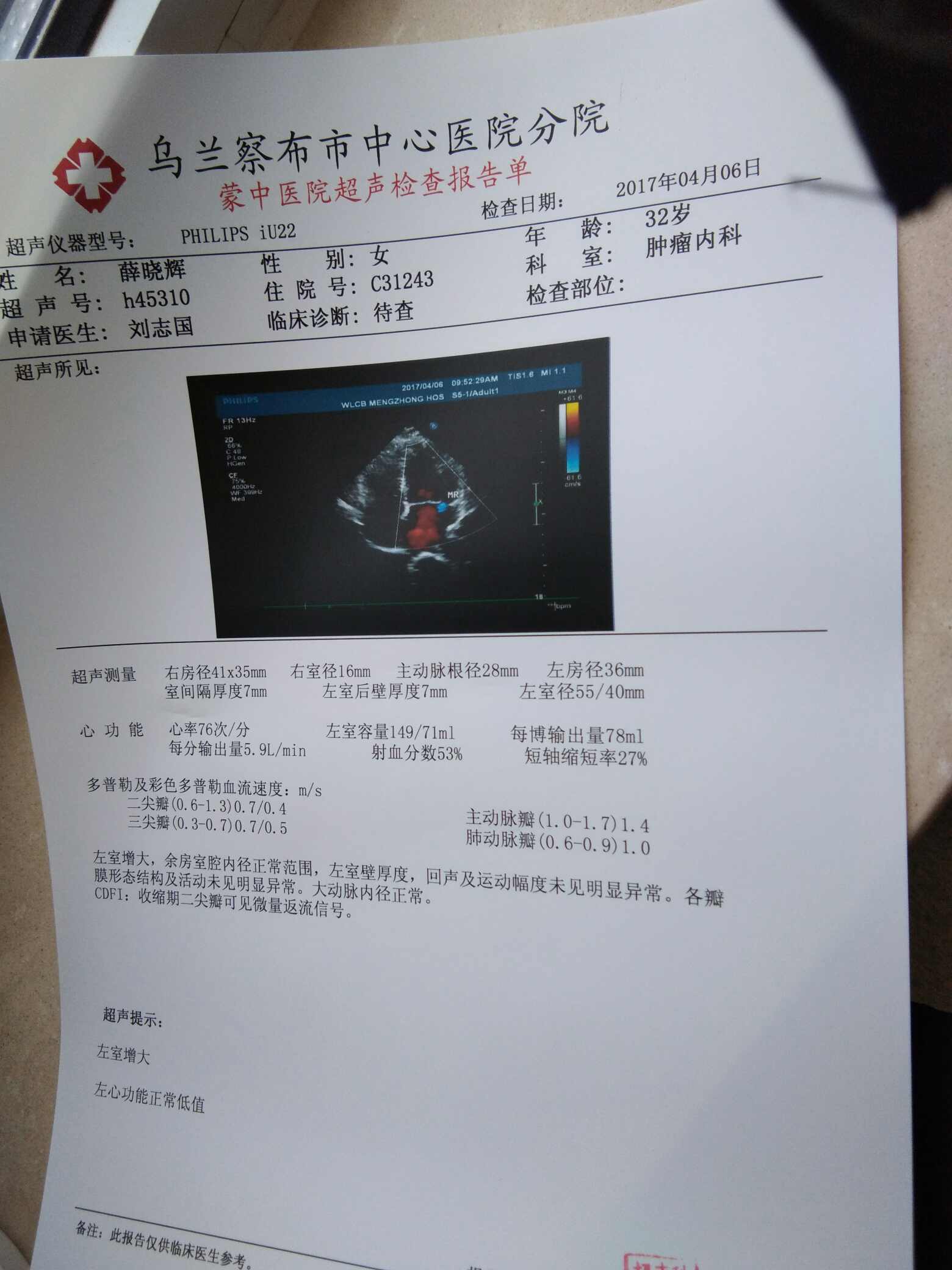 我就奇怪了,不到二十天做了4次心脏彩超,一回集宁打赫前做心脏彩超总有毛病,回来一做没啥毛病,原因?啥情况,有是没有毛病,打赫从430输成160了,这回,回包头医生叫去心内科看看,结果出来第一个单亲们帮忙看看,前几天回集宁做的第二个单,我今天拿出集宁单叫医生看了,医生说从做,结果做出第一个单,准备让医生输点液,医生一看没毛病输什么了,亲们弄的我小心脏那个急呀,听谁了,那个医院准