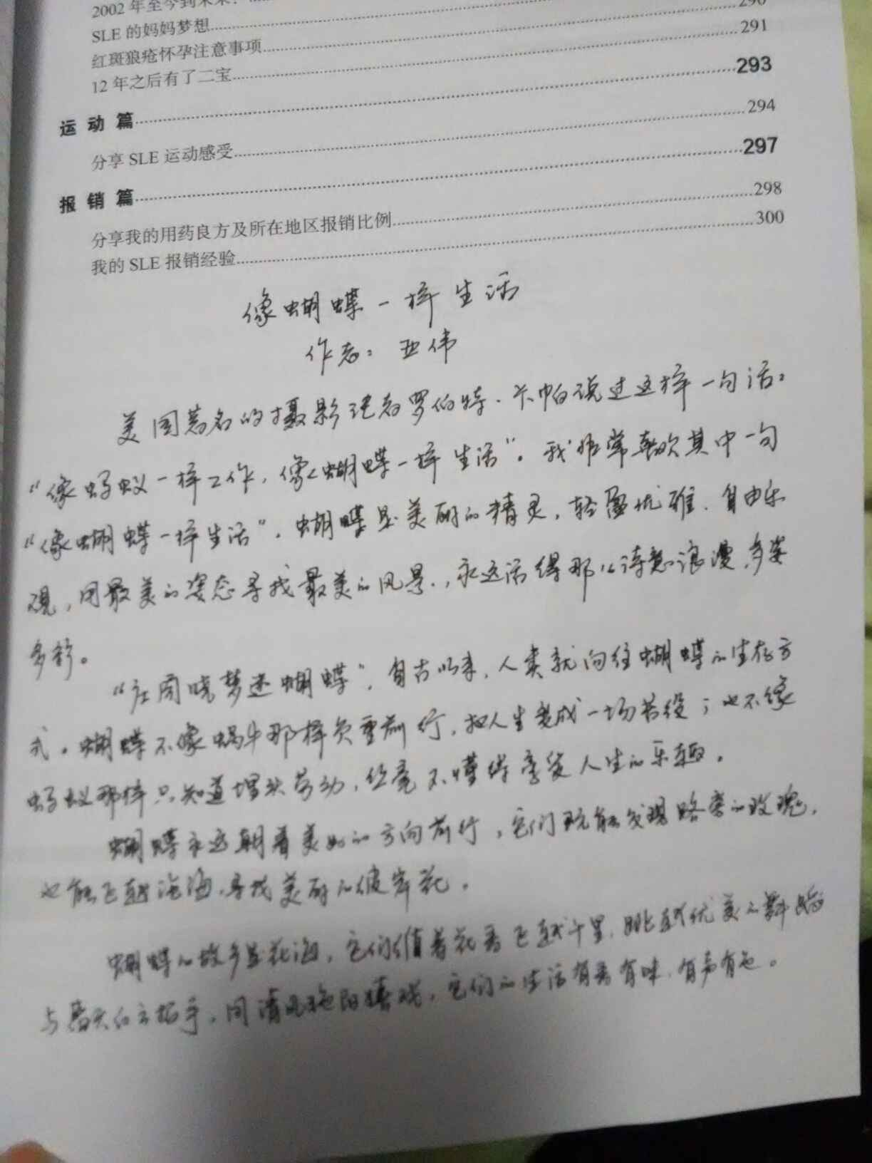 自生病我便养成了记病历日记的习惯,也许是因为药物的副作用让我的记忆变差,睡眠不好,每天吃什么药,药物反应,干什么事,感想感受都要认真记下来,(每次住院我都做为写作的最好时间,有的文章是夜里在医办室,病床上借着走廊的灯写的,有时怕感染医生安排单人间正好无人打扰,睡不着便拿着纸笔写东西),当觅健征稿时,积极投入到其中,毫无保留地与病友讲述分享自己的经验和感受,飞舞的蝴蝶111,136有我的故事,不再详述了!