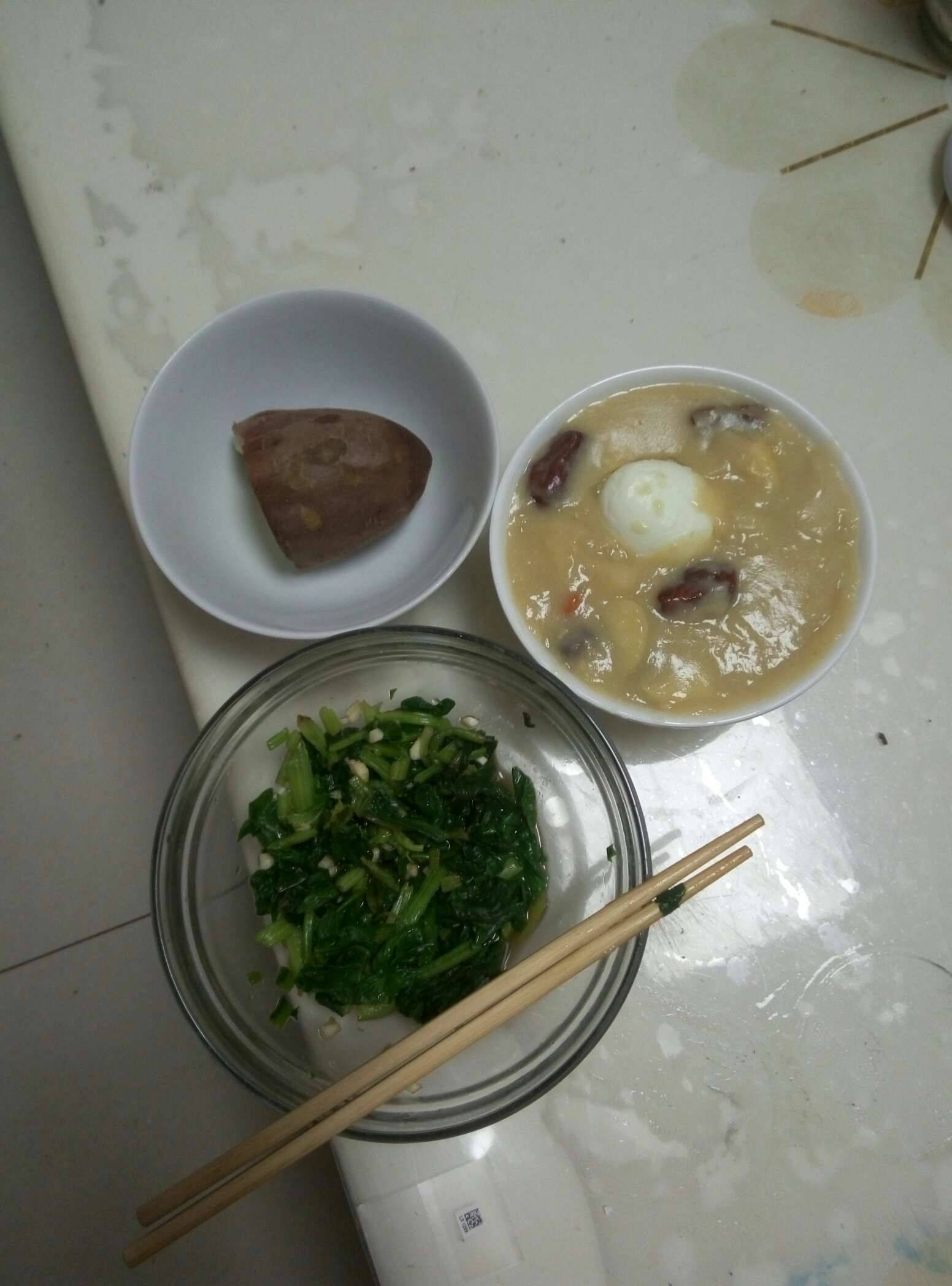 昨天复查回来了一切正常很开心,今早静心的做了早餐犒劳自己一下,以后好好吃饭好好锻炼开心生活,关于手黄脸色黄的问题有个姐妹说也是这情况,我查血了都没问题,医生说黄是看眼睛呢,很可能是化疗副作用,放心吧没事,这次发现一个病友脸色也有点泛黄她原来皮肤特白,只要身体健康了那都不是事了!早餐,玉米面,谷米,麦孚,红枣枸杞,银耳,红薯,鸡蛋,菠菜,犒劳犒劳自己的身体,吃起来!