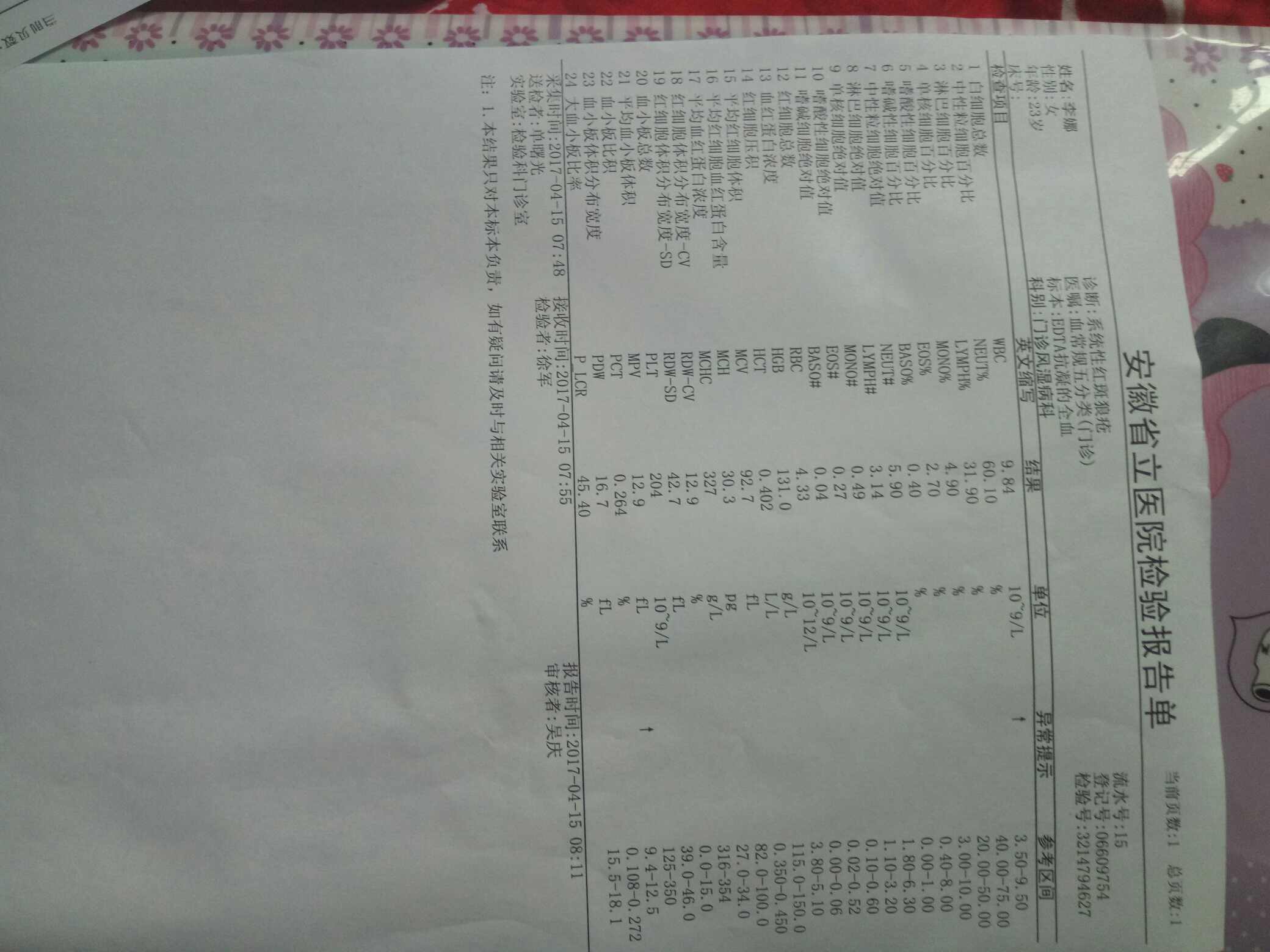 好干净的化验单哦!