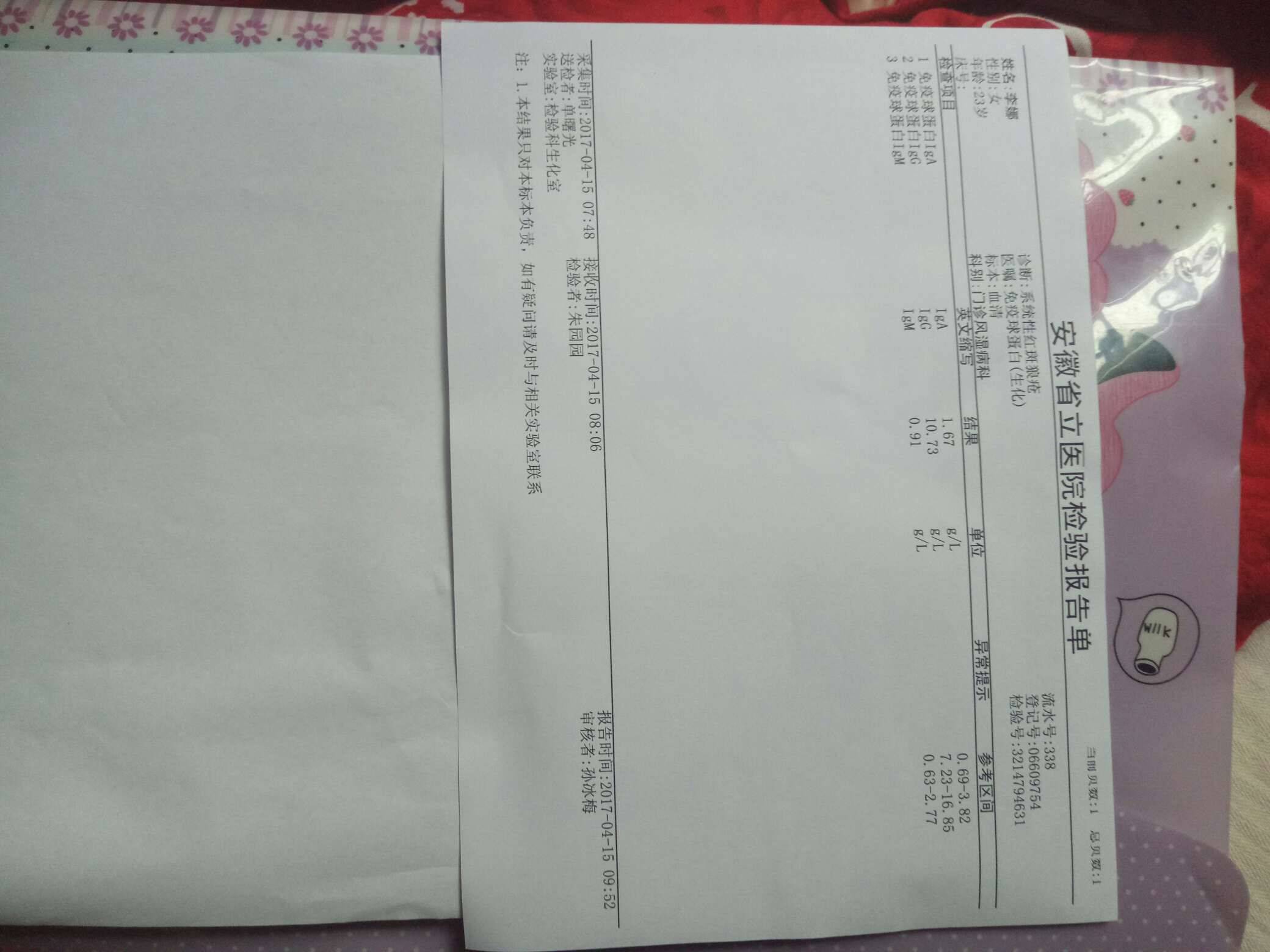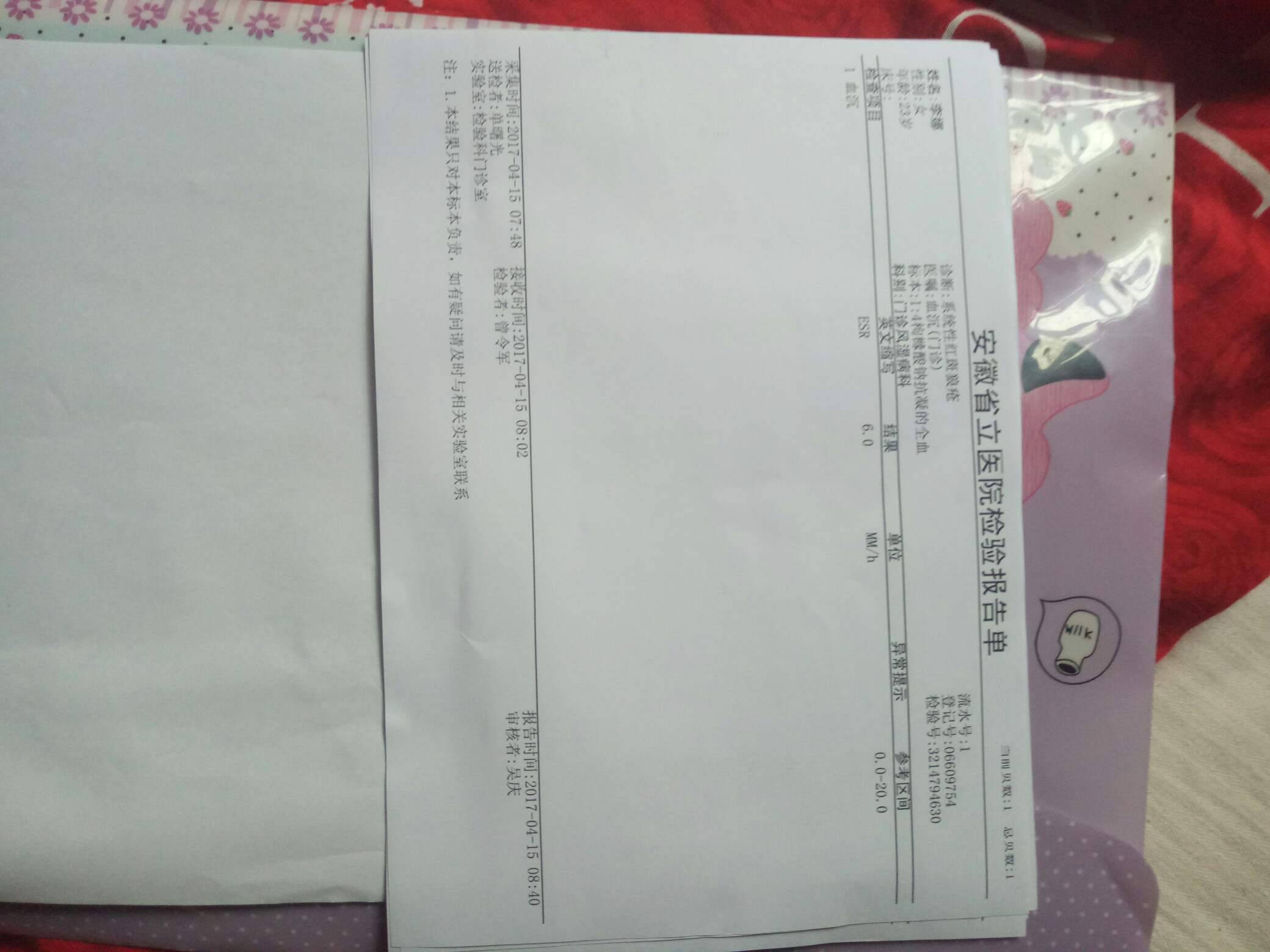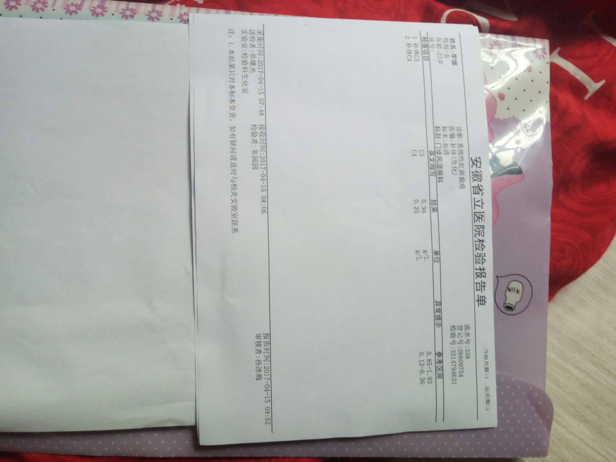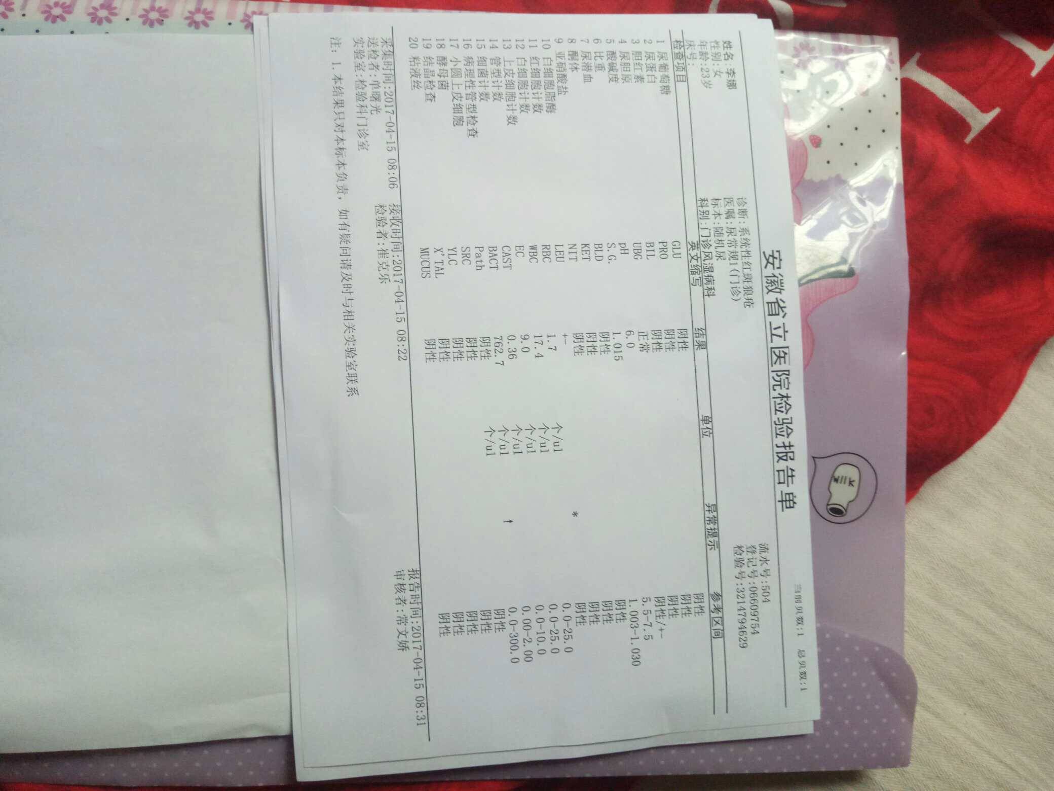 他说那你去北京协和医院在检查一下,正好我大表叔在北京,他帮我挂号,我去北京以后就直接看了侯勇,他给我做了一系列关于狼的检查(化验单在之前的帖子发过)都是正常的,就连很多狼不可能正常的抗体,我也都正常,我记得侯勇和我说过一句话,你真是幸运儿,这是千万分之一的几率,因为你没有最初确诊的化验单,所以我们不能说你是不是SLE,但是从我们医院看呢,你是没有的,但是也不能排除你是吃药吃好的(我是13年确诊的)之后都准备停药了,结果怀孕了,一直保持一粒激素,两颗纷乐,结果孕期也特别顺利(具体的怀孕过程可以看之前的帖子)40 4周顺产七斤七两六的男宝宝,在我家宝宝六个月的时候我又怀孕了,但是由于各种原因我做了无痛人流,但是检查身体还是很好,谁知道时隔三个月,又怀了,这次准备留着,现在宝宝十个月了,昨天去风湿科复查,结果又是好的,这不得不让我怀疑,我到底是不是狼(我不忌口,化妆,晒太阳……不能干的事我都干了,而且生第一胎的时候我一直在上班,一直到八个多月才没上班,这一胎也准备这样,目前怀孕快两个月,还在上班中)