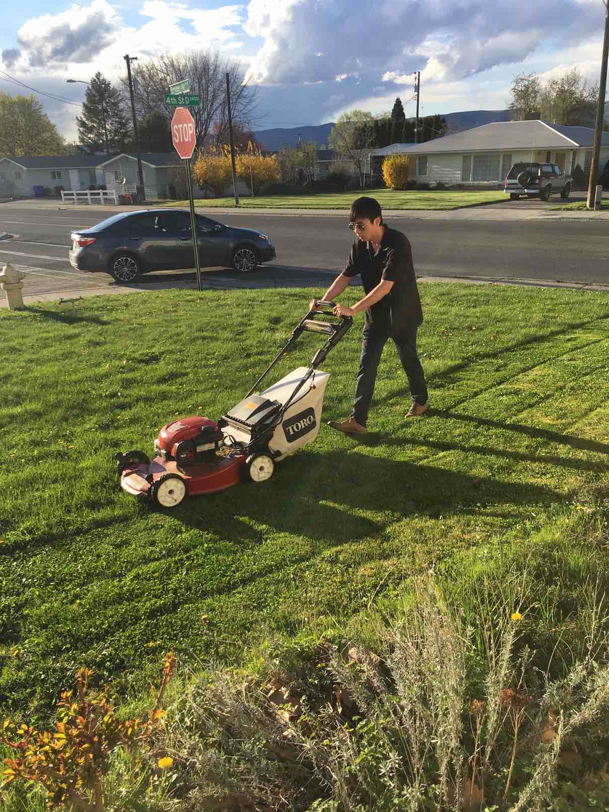 这会就看出有儿子的好,HOUSE草坪打理挺累的,小伙子干起来很轻松的,是美国吧。