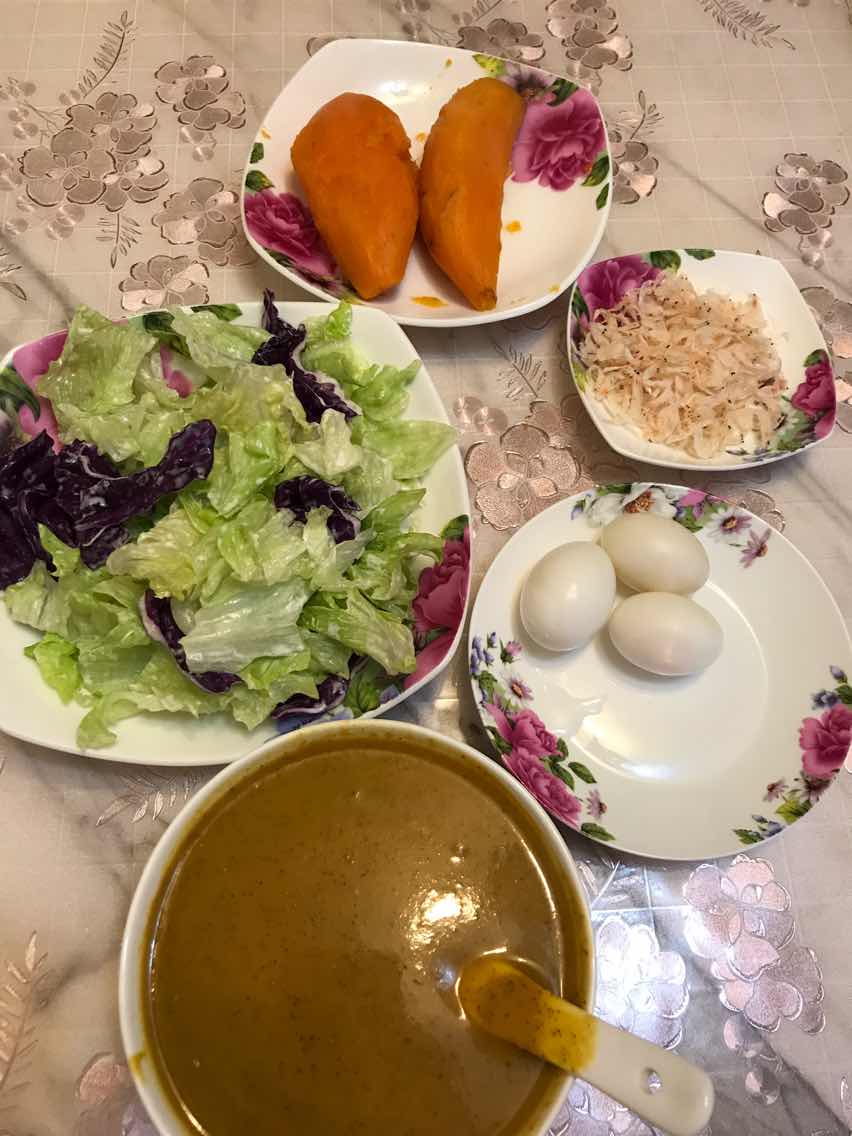 今天的早餐,红豆、红枣、红皮花生加了枸杞做的豆浆,生菜沙拉、三个鸽子蛋、两个地瓜、一小碟小虾皮,我是不是吃得有点多了