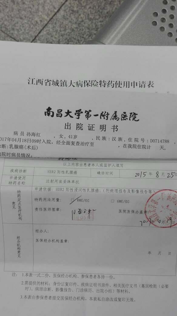 我是2015年8月25日手术,昨天来复查,医生说我还可以赫赛汀,而且从今年一月份开始农医保和城镇医保已经合并,也就是说农医保也可以报70%。出去所有的报销,我自己只要出3万多就可以了。